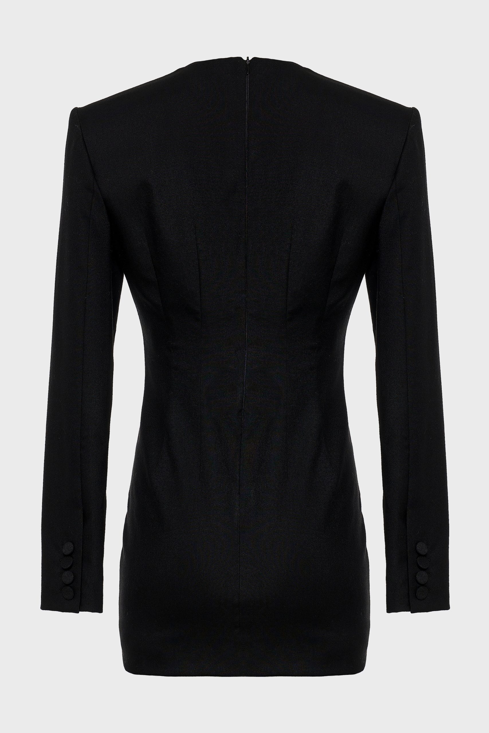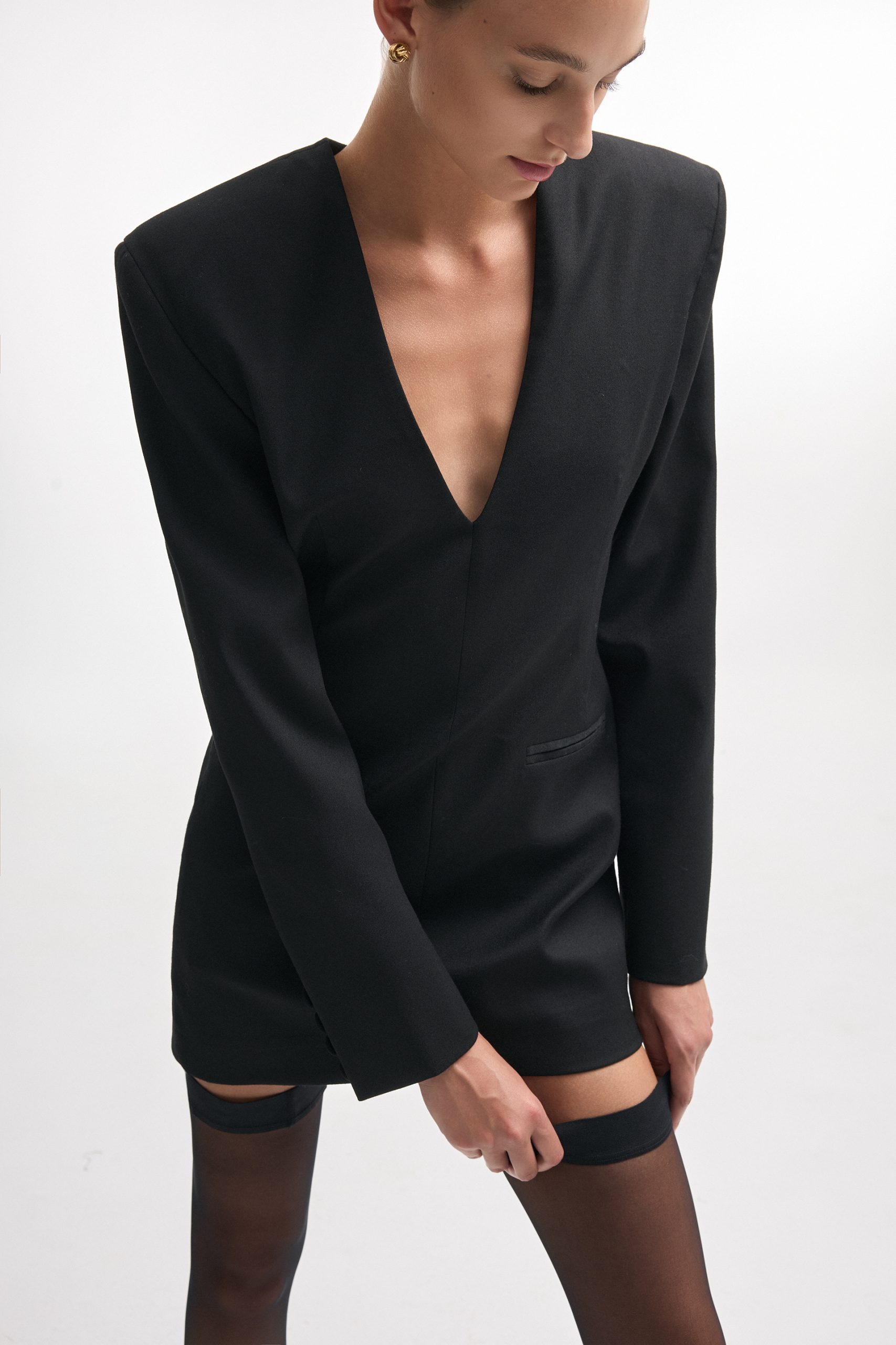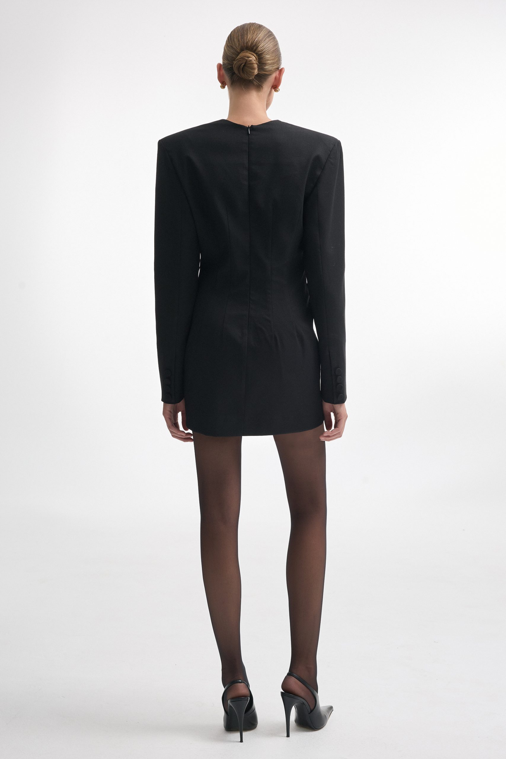 The Night Shift dress has a sculpted mini silhouette with sharp shoulders and a deep neckline. Made to move comfortably with you while keeping its shape, it is designed to flatter the figure. It works for both day and evening looks when you want a bold, modern statement.