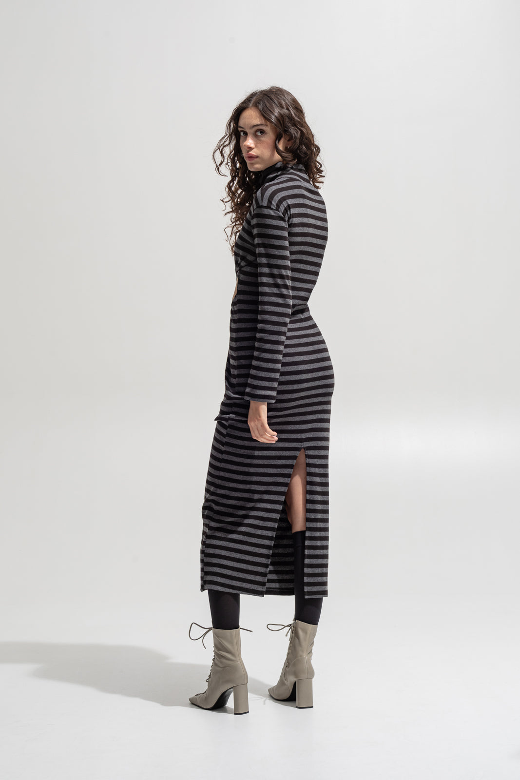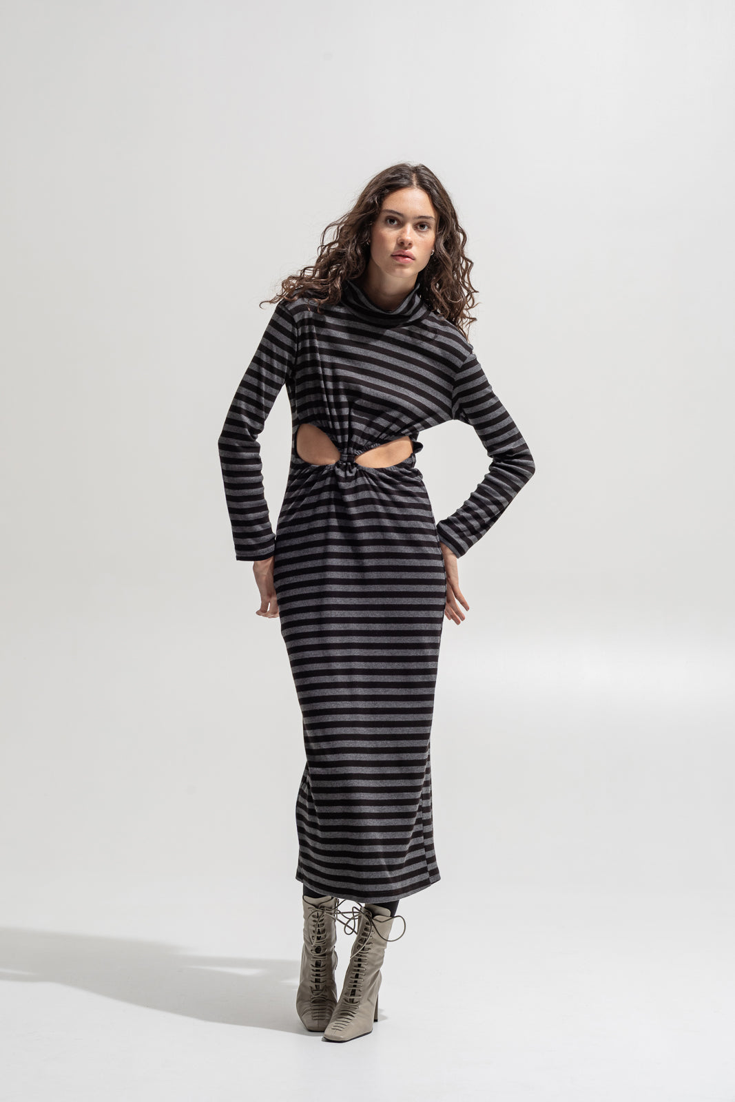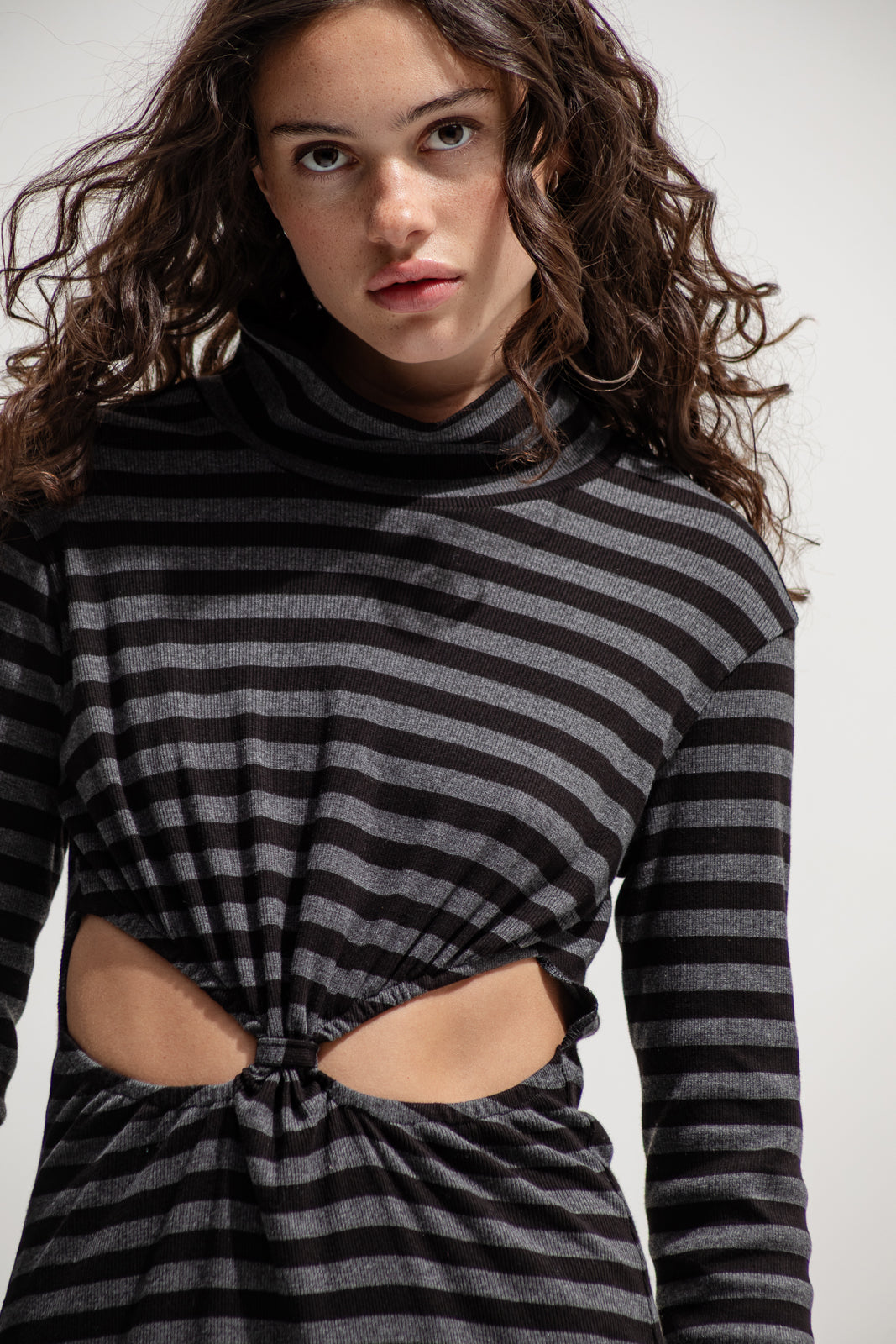 A modern silhouette with a daring twist. This long-sleeve striped dress features a knotted front detail that creates flattering cut-outs at the waist — revealing just enough skin while keeping a sleek, body-skimming line. Designed in soft ribbed stretch fabric for comfort and movement, it’s finished with a high neckline and back slit for effortless wearability.