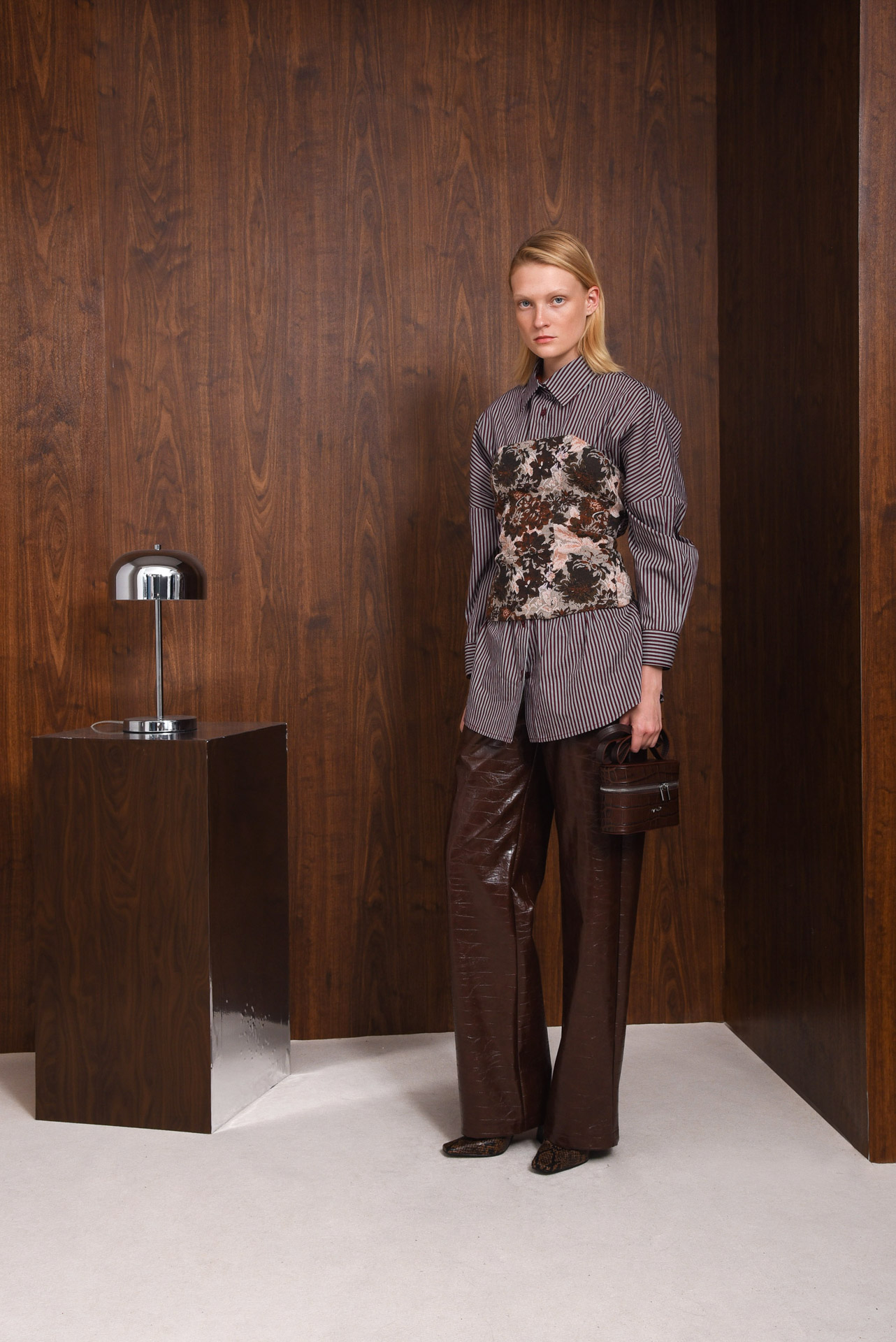 The Own Corset features a structured floral jacquard design in brown, beige, and black tones. It has a fitted silhouette, boning details for support, and an adjustable lace-up back. Fully lined for comfort, it can be worn over shirts or dresses, adding a modern yet elegant touch to any look.