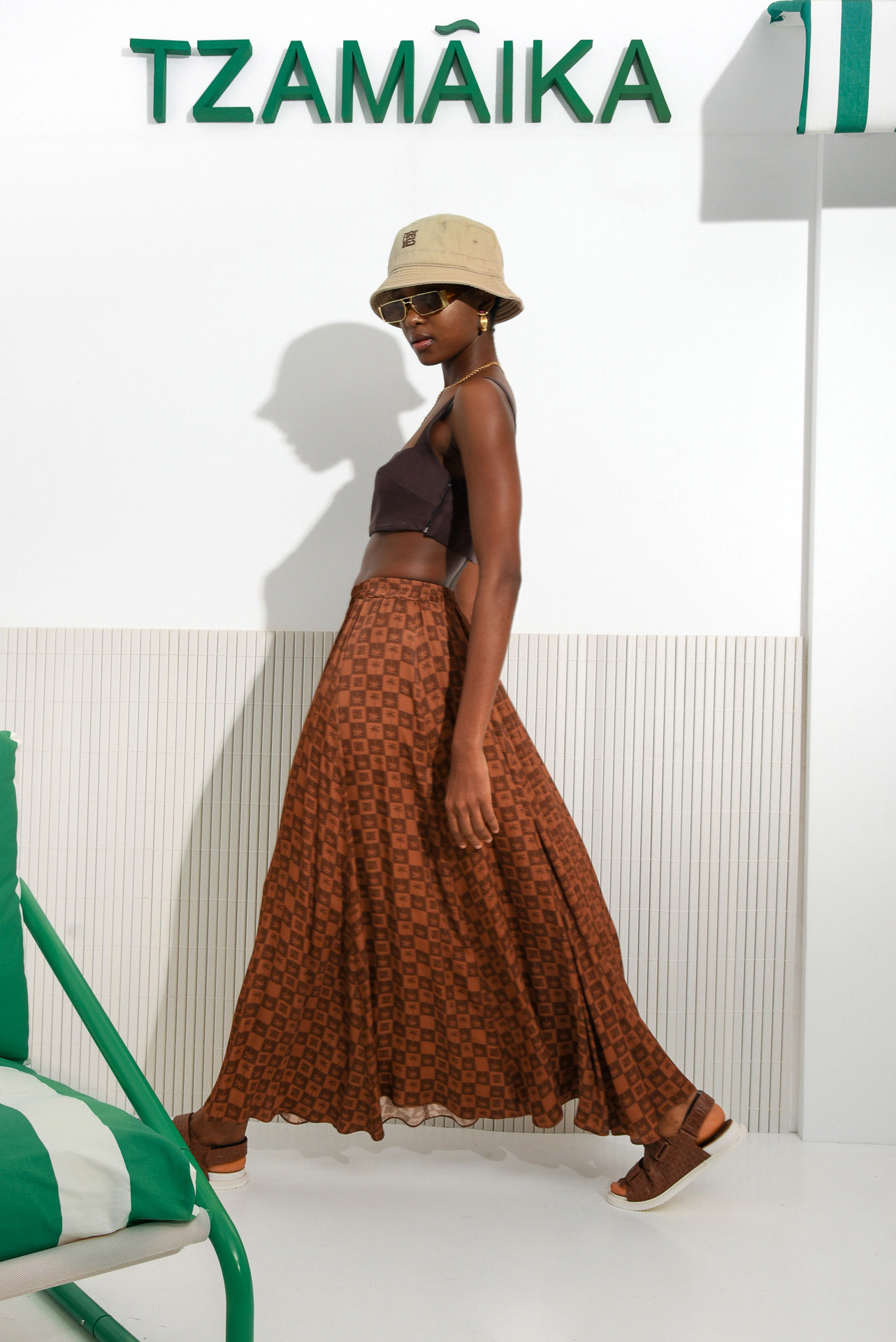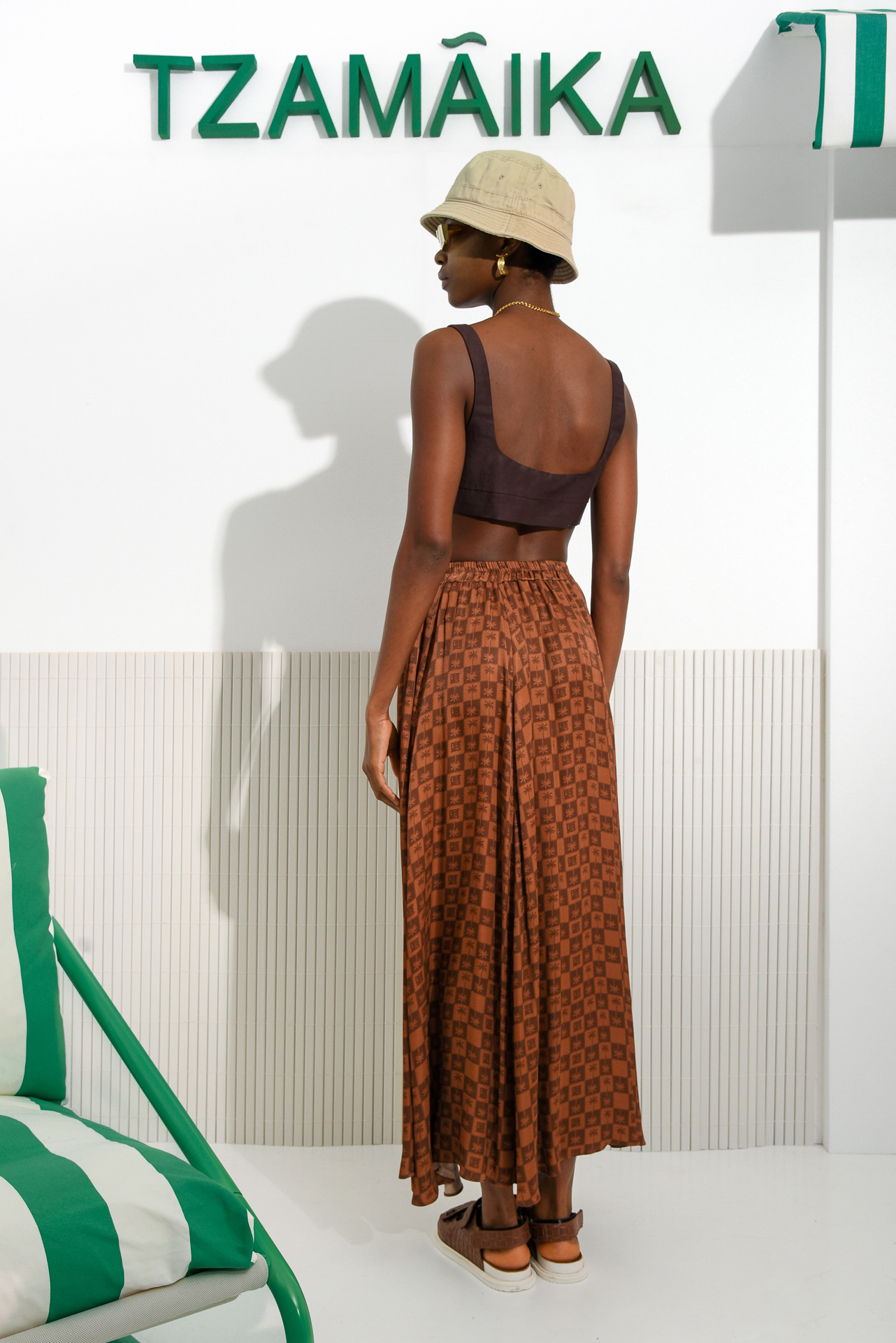 The rich brown base is printed with a tonal palm-inspired geometric pattern, adding subtle texture and movement.