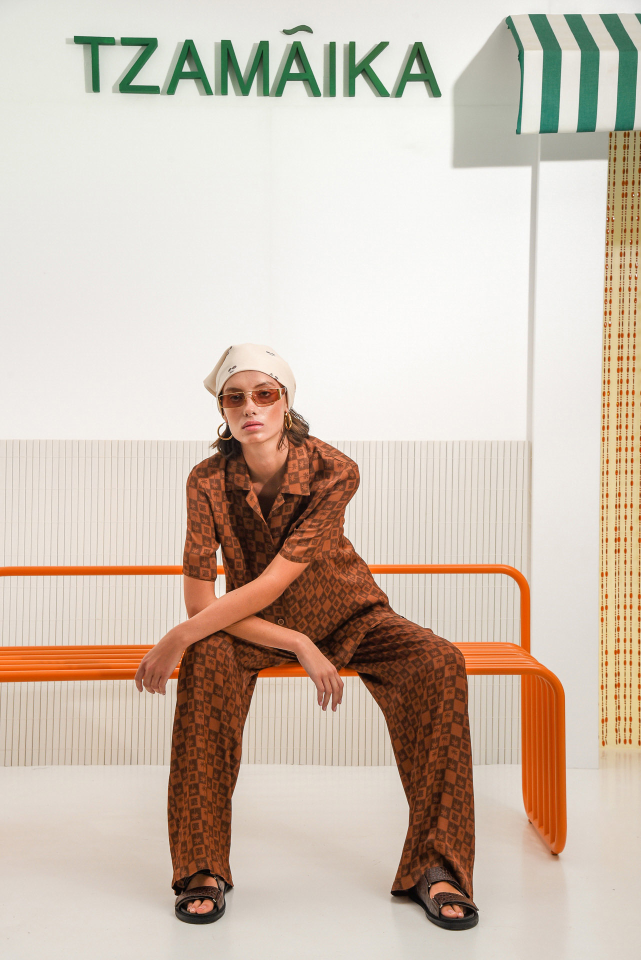 The brown geometric palm print adds a bold yet timeless touch. Unlined and pocket-free, perfect for effortless summer dressing.