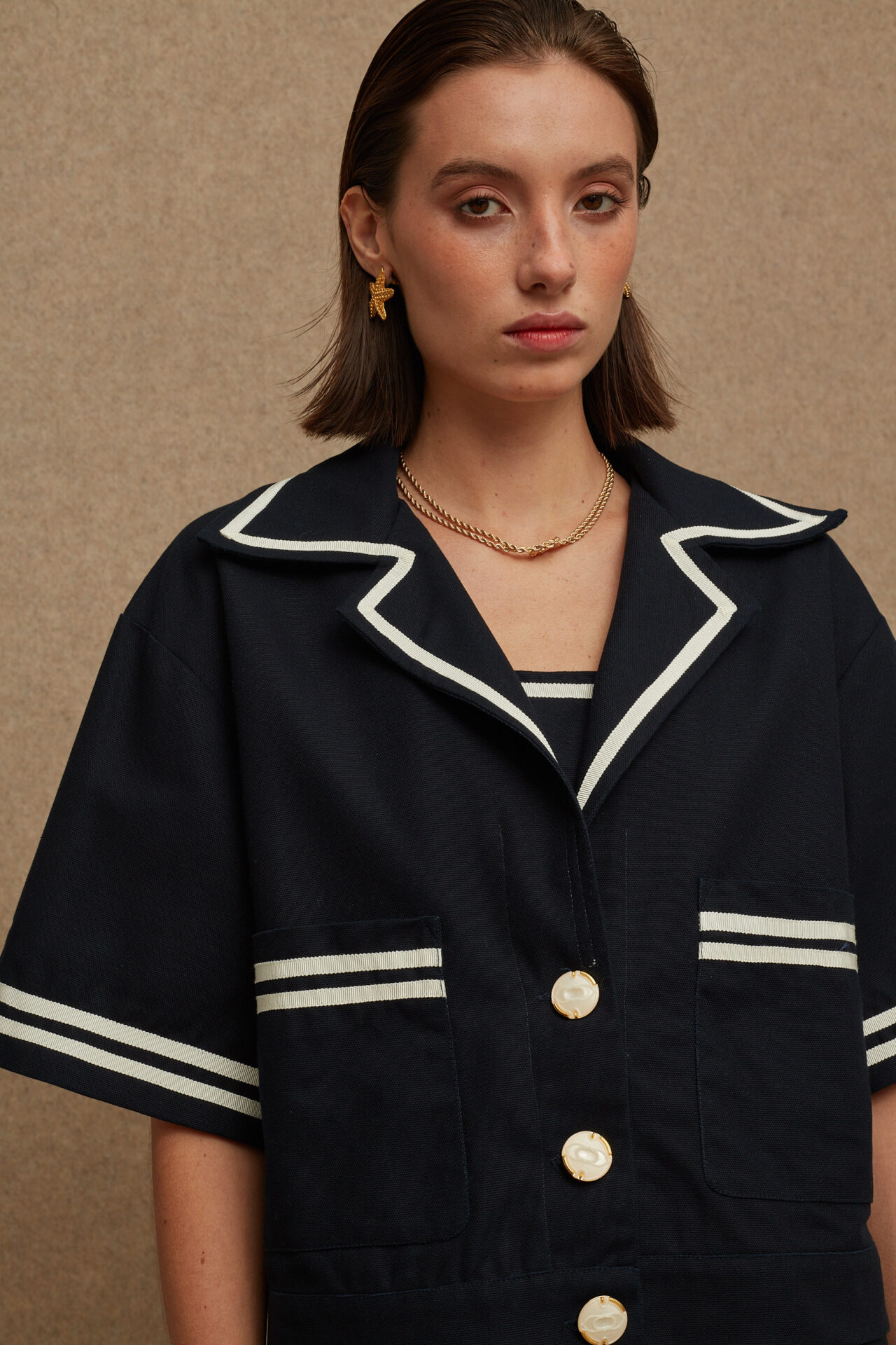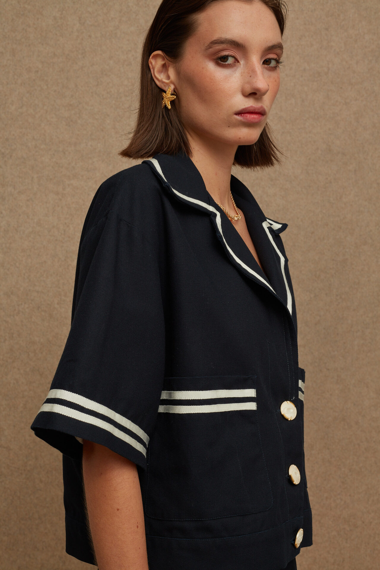 - A short sleeve blazer made from cooling fabric with large collars, wide fit and embossed buttons.