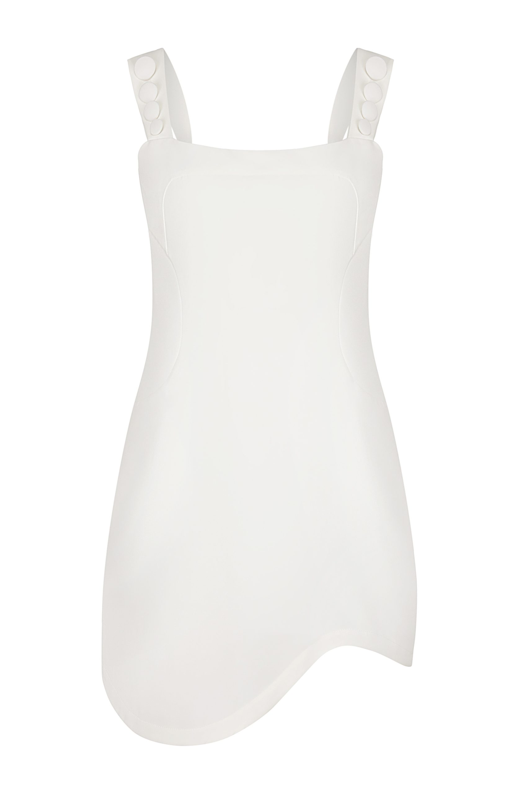 A mini dress with wavy hem & large fabric buttons on shoulders.