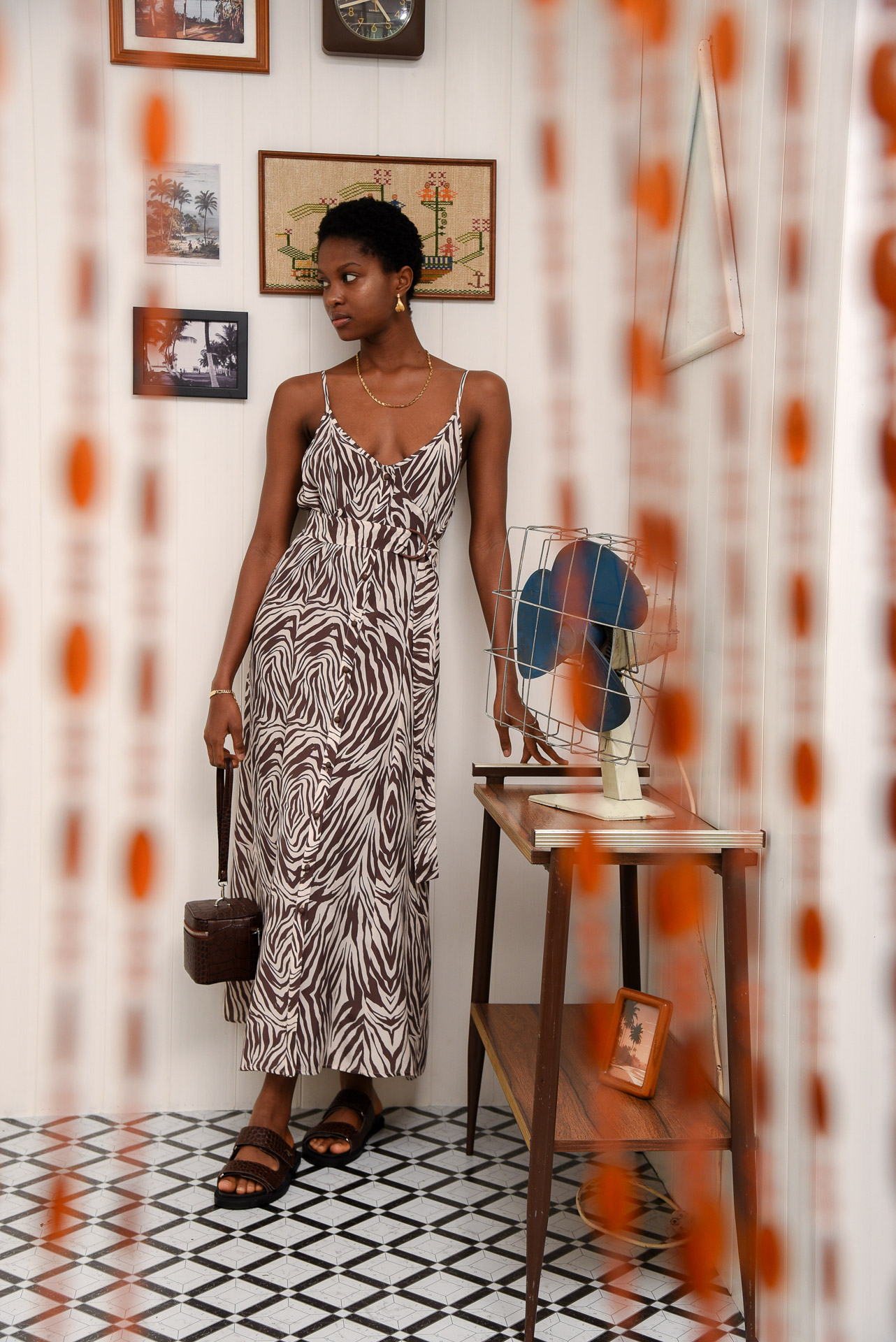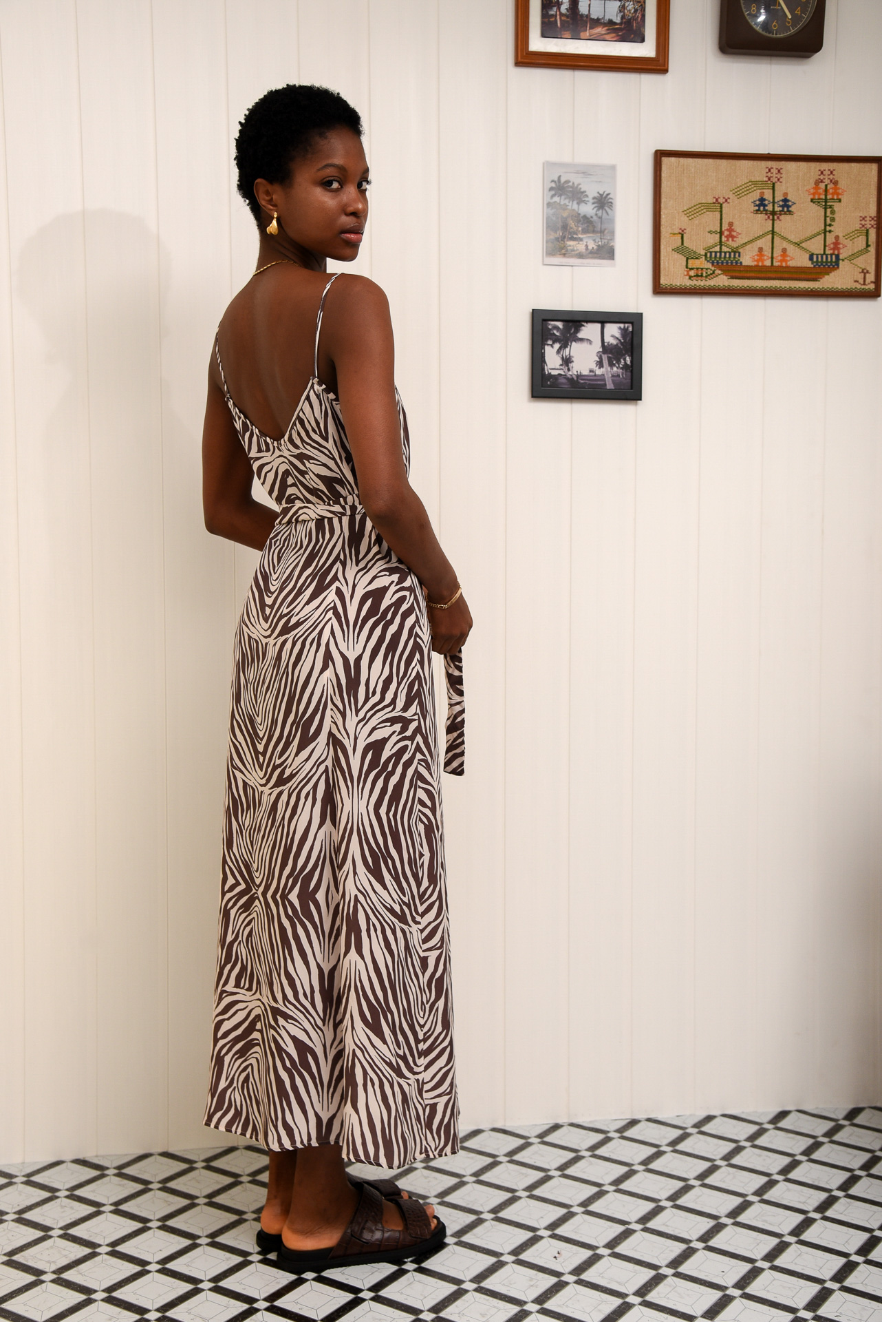 The Pepper Pot Dress is a sleeveless, midi-length dress with a soft zebra print. It has thin adjustable straps, a deep V-neck, buttons all the way down the front, and a matching belt with a round buckle to tie at the waist. Made from lightweight, breathable fabric—it’s perfect for warm days.