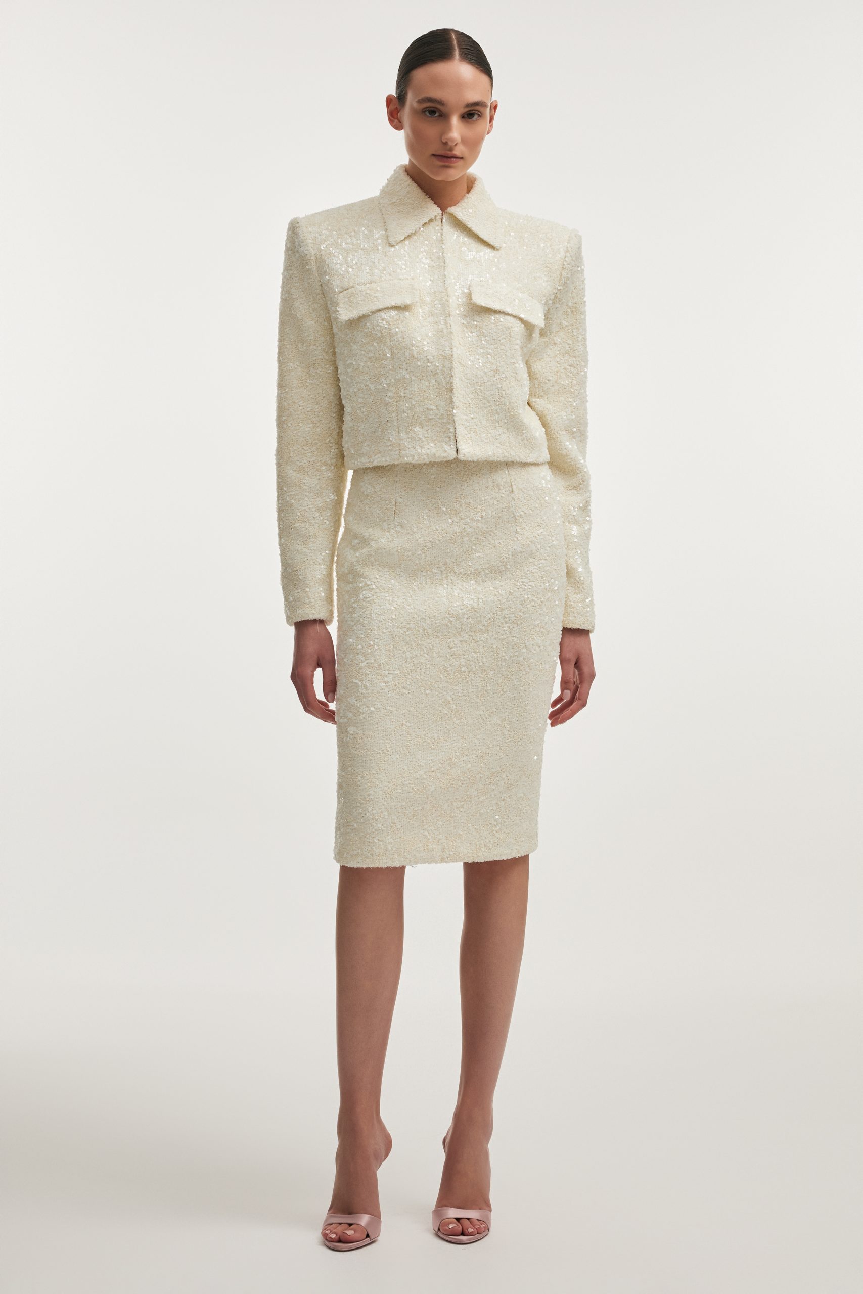 A refined midi skirt designed to contour the silhouette with quiet elegance. Crafted from sequin tweed, the texture catches the light subtly, creating a soft shimmer with every movement.