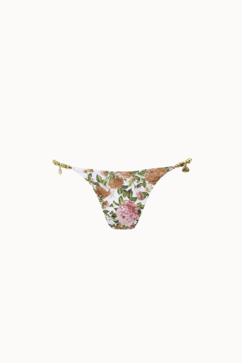 These thin strap bikini bottoms in a pink floral print adorned with gold shell embellishments are crafted for a flattering and a feminine fit.