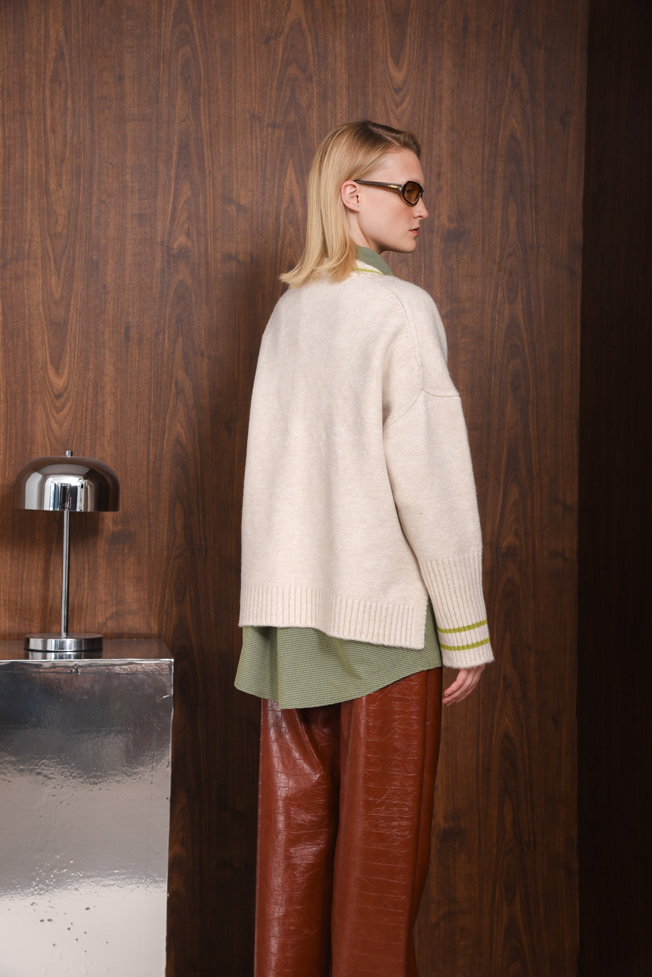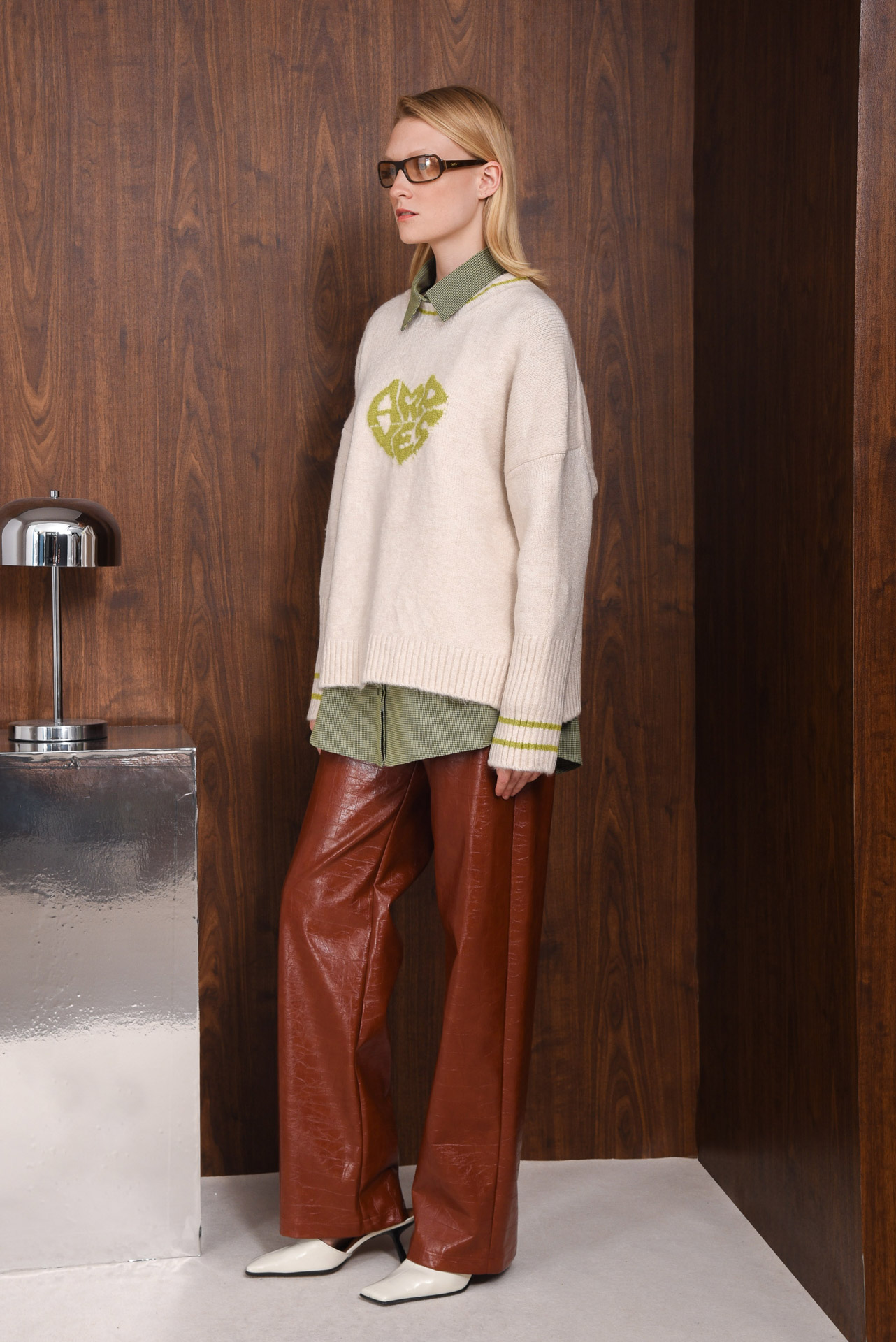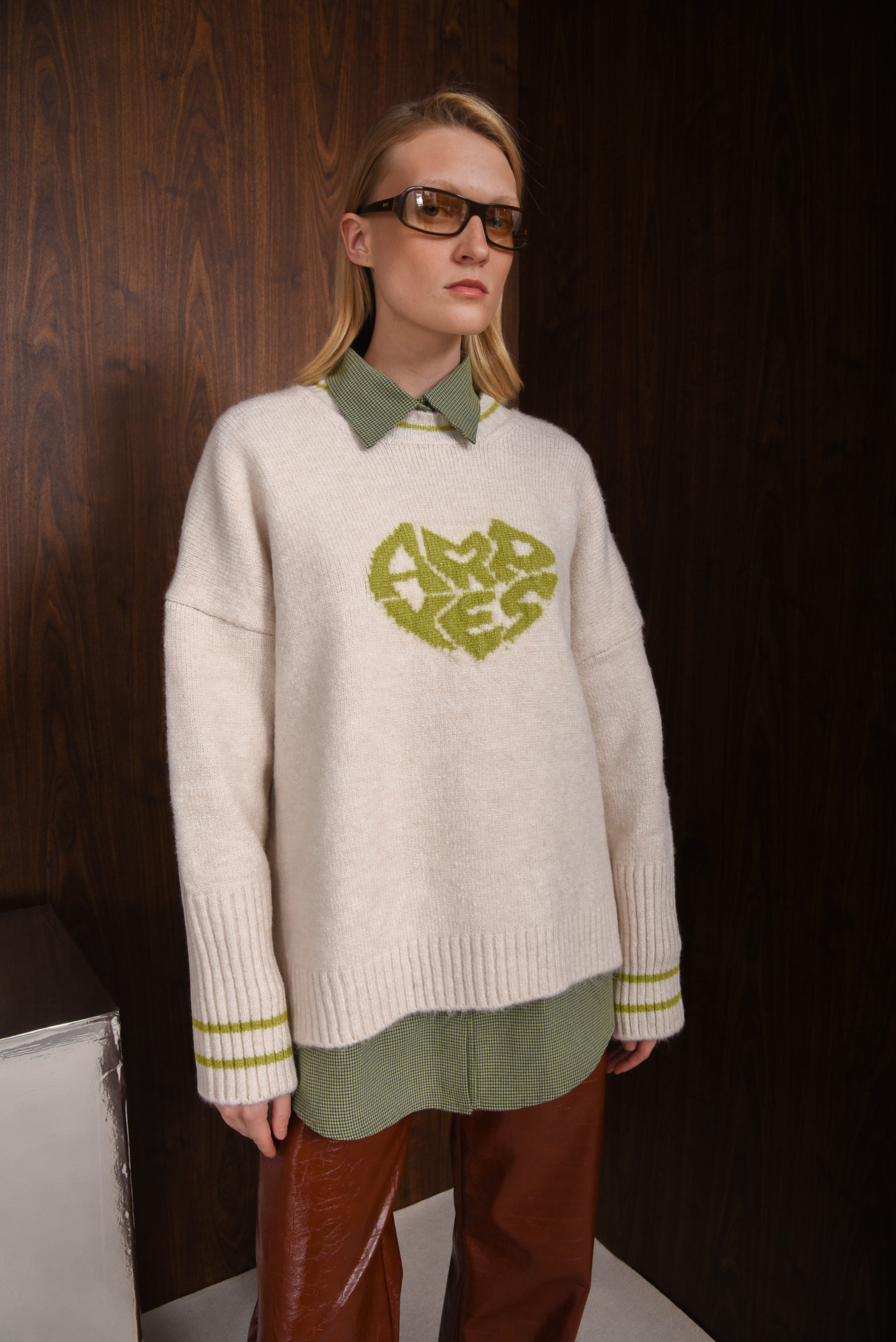 The Pleasure Pullover is a soft, oversized knit with a relaxed fit. It has a heart-shaped “ARPYES” logo on the front, striped details on the cuffs and neckline, ribbed edges, dropped shoulders, and small side slits. Warm, easy to layer, and comfortable for everyday wear.