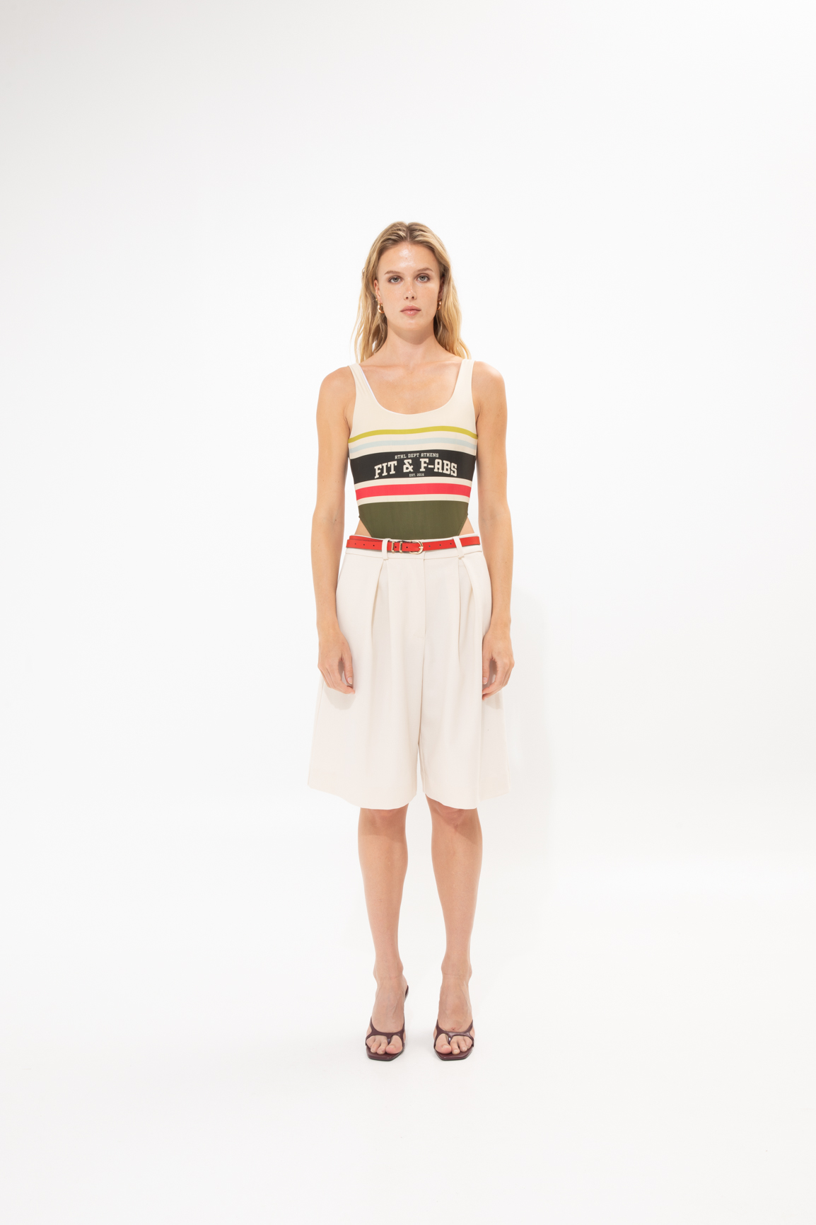 This thin belt features tonal top stitching and fastens with a bronze buckle.