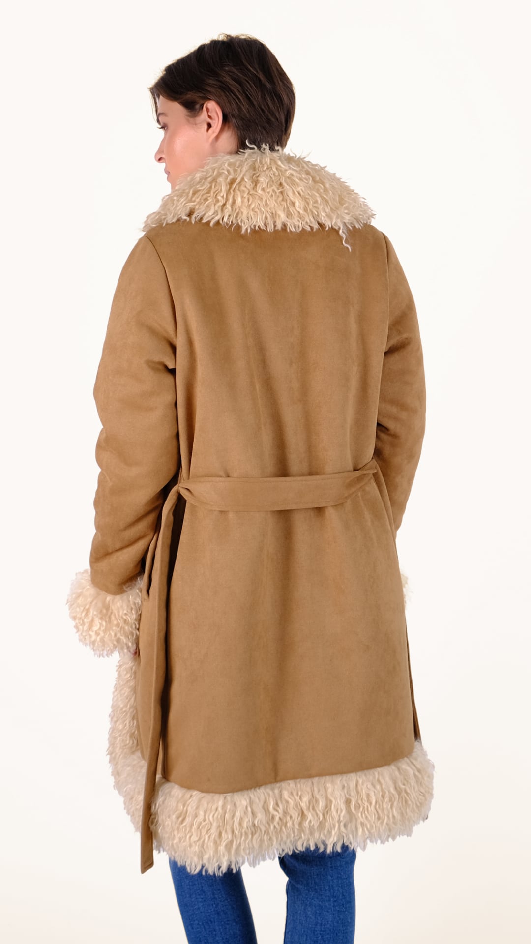 Το Romina επαναπροσδιορίζει το κλασικό παλτό με μια πιο statement προσέγγιση.Το faux suede συνδυάζεται με Mongolian γούνα για μια πλούσια υφή, ενώ η αποσπώμενη ζώνη αναδεικνύει τη μέση με effortless στυλ.
