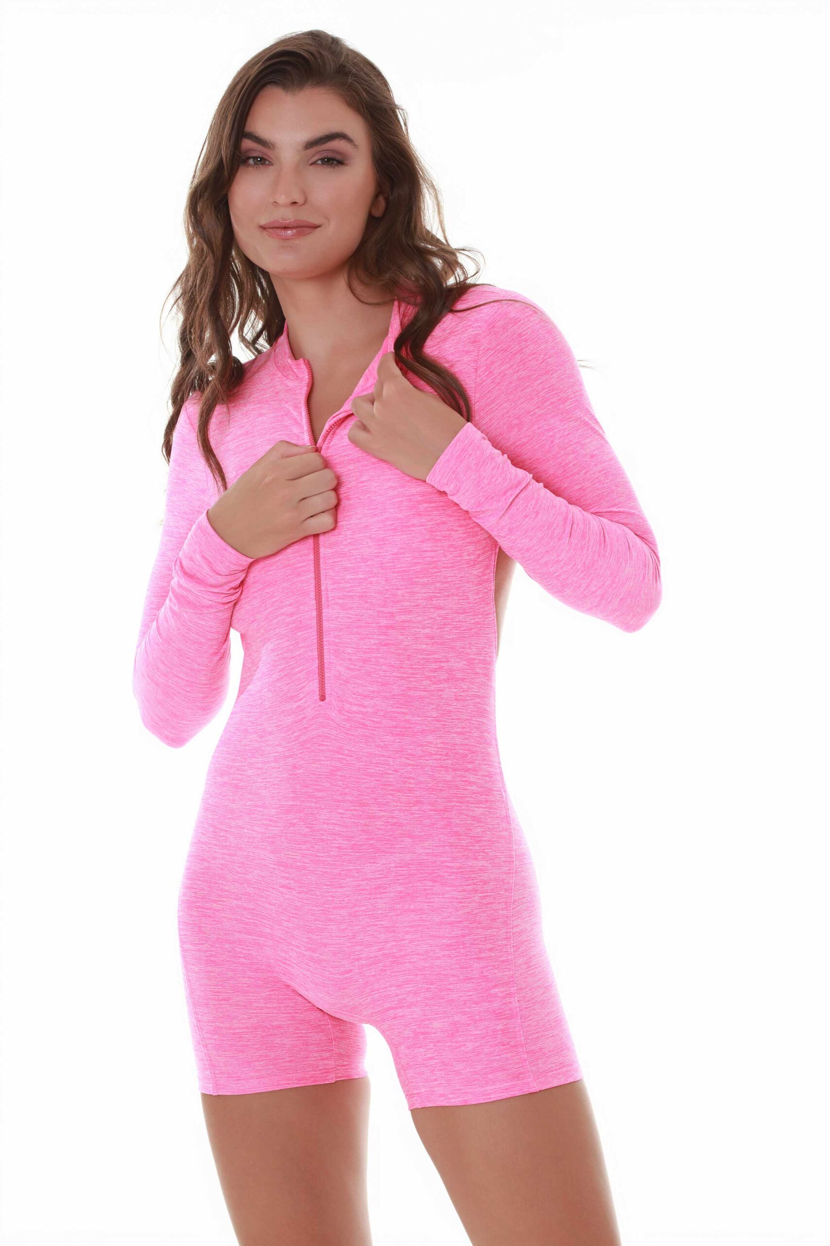 • This pink long-sleeve jumpsuit features a stylish zip front for easy wear and an alluring open back design that adds a bold touch.