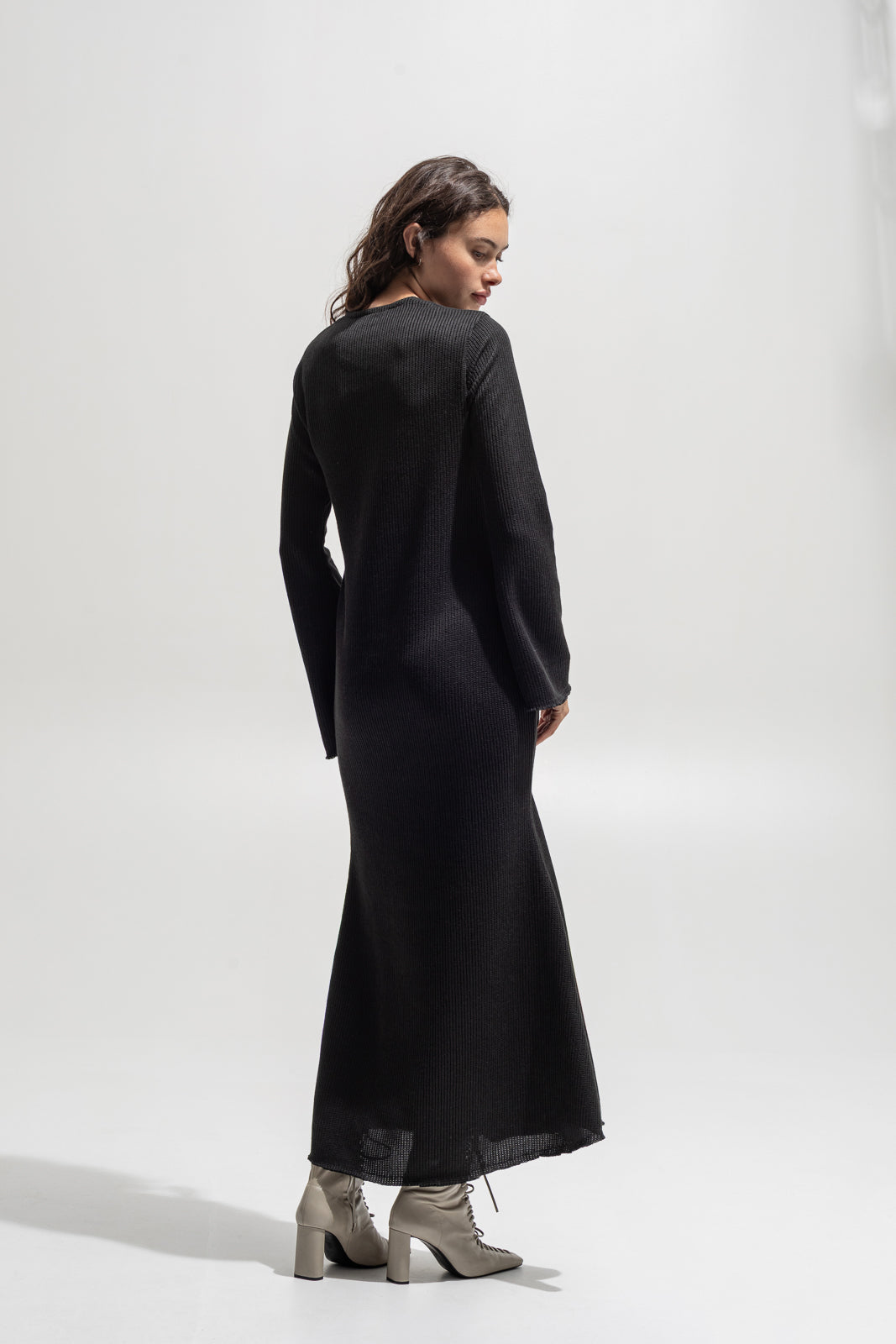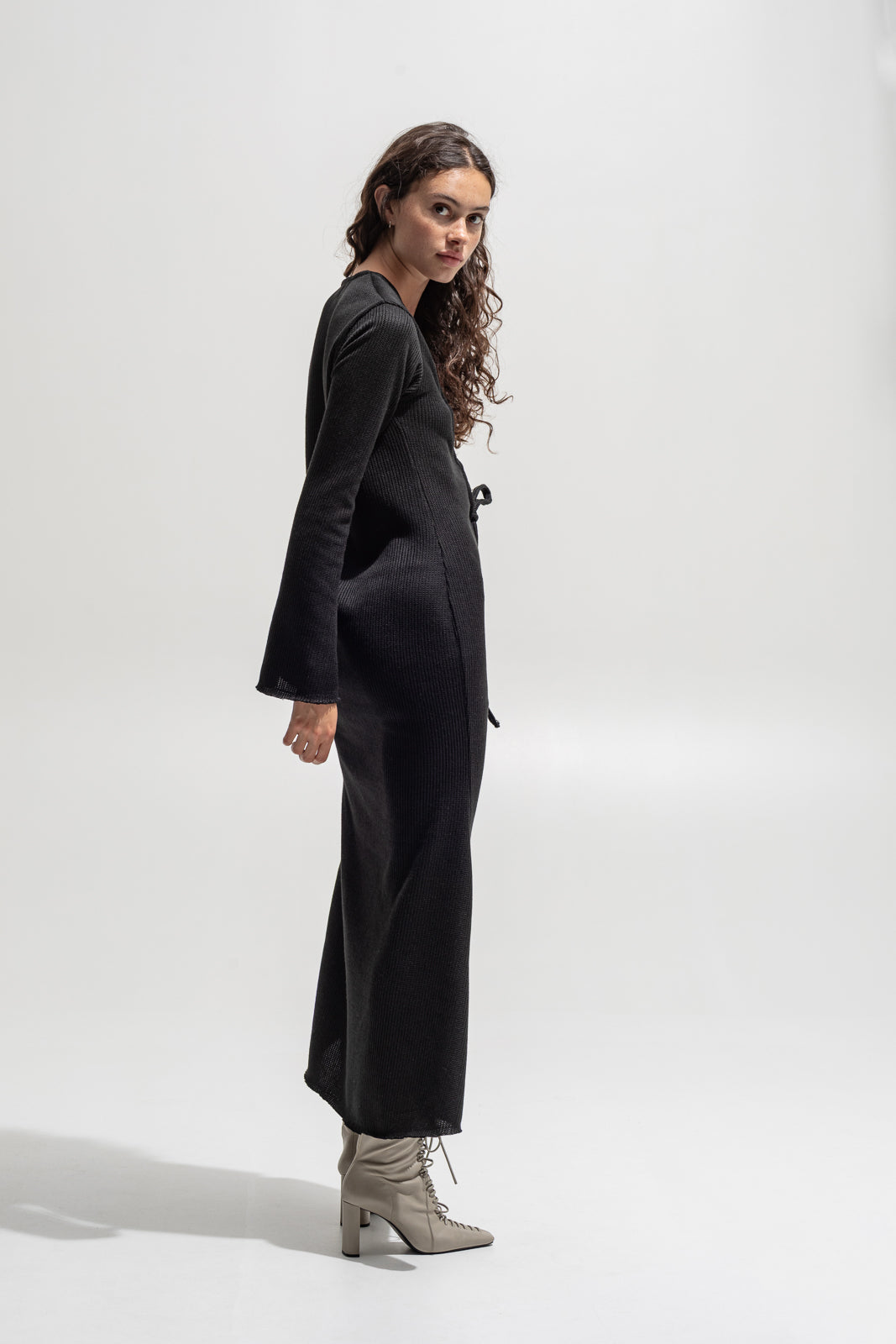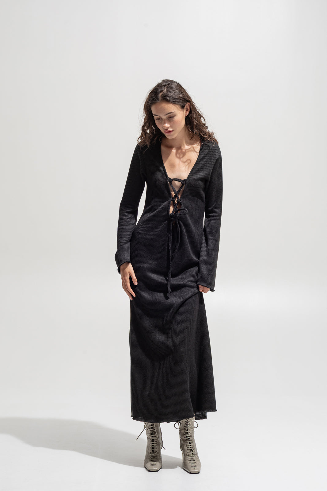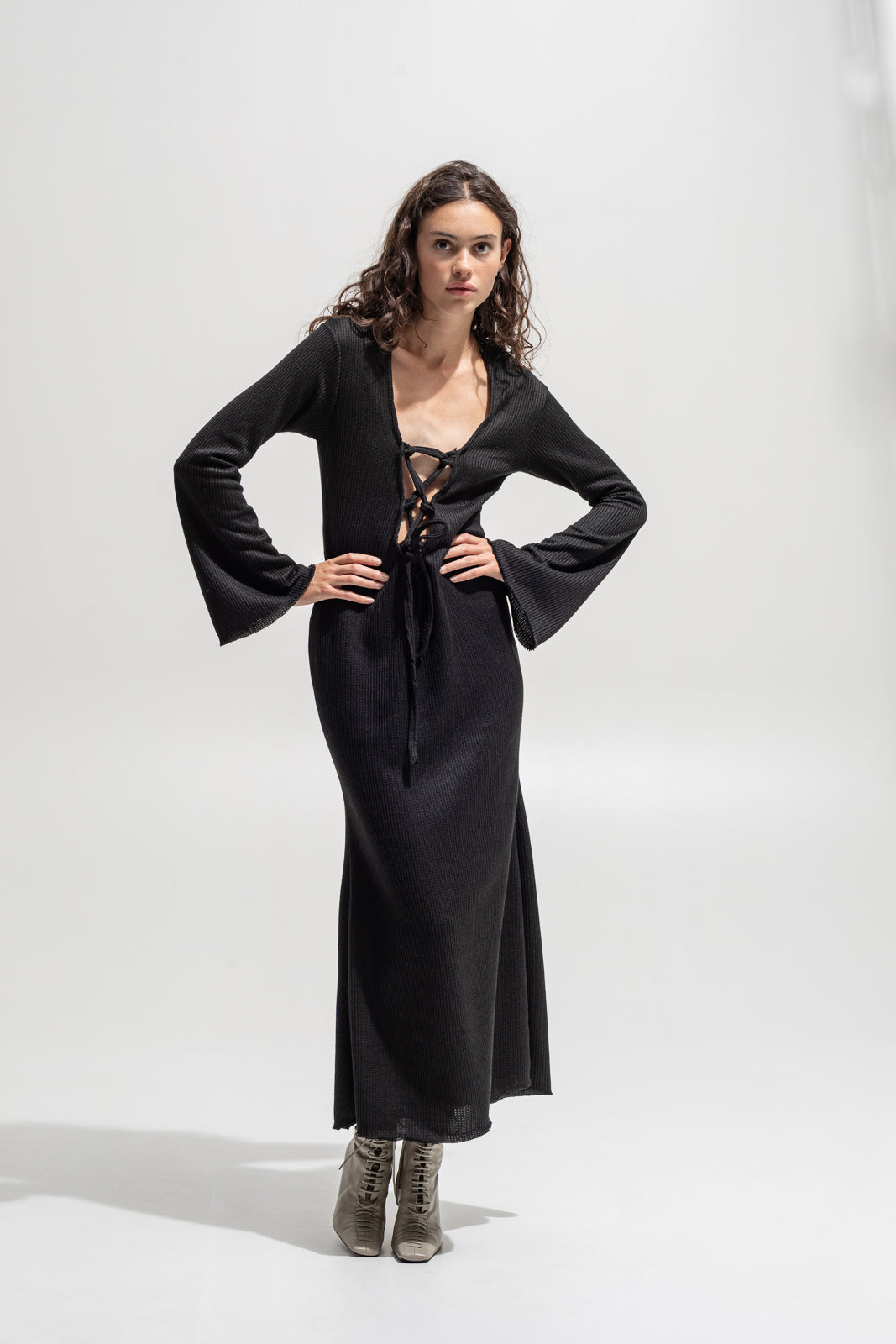 A minimal piece with a striking twist — this maxi knitted dress in forever black offers both comfort and edge. Featuring a plunging neckline with bold lace-up rope detail and slightly flared sleeves, it combines laid-back ease with contemporary allure. The ribbed knit fabric sculpts the silhouette while keeping it casual and wearable.