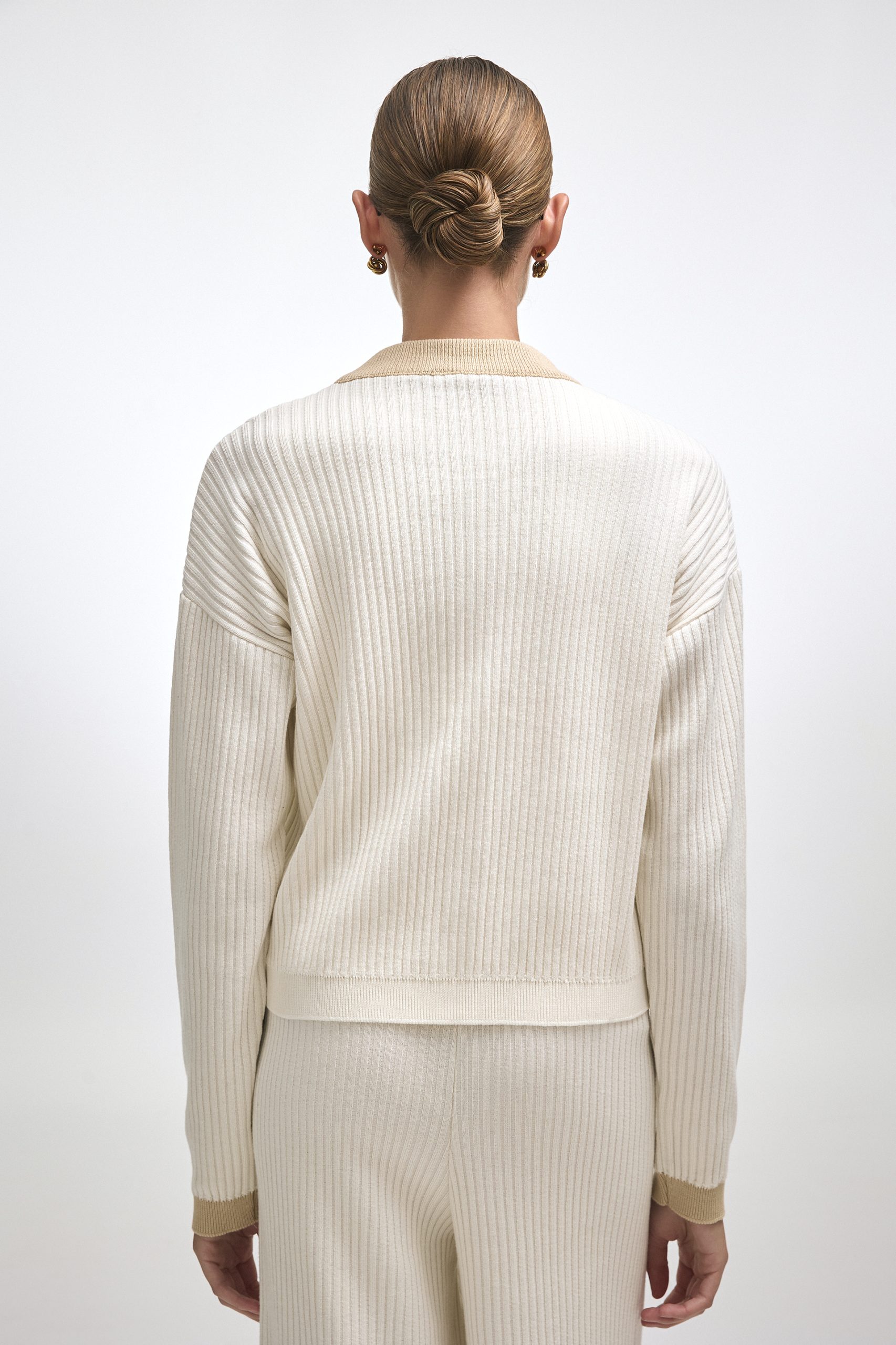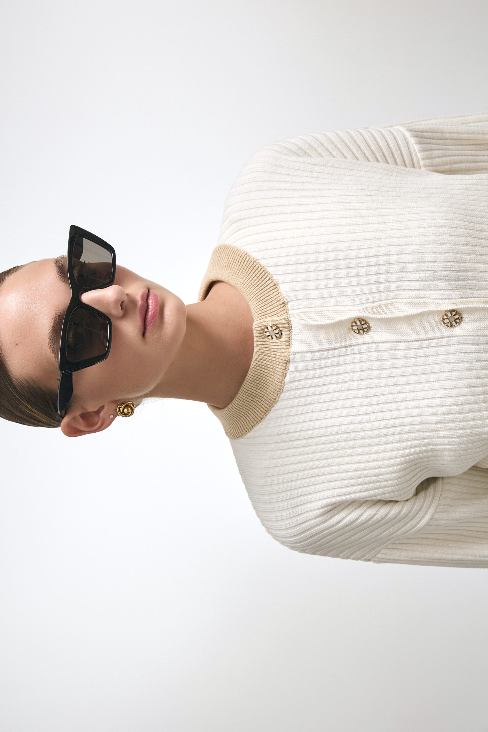 A softly structured cardigan knitted in a fine rib for a fluid, close-to-the-body fit. Designed with a clean round neckline, elongated sleeves and subtle contrast trims at the collar and cuffs. Finished with delicate statement buttons that add a discreet point of interest. A timeless knit that transitions effortlessly from day to evening, worn alone or as part of a coordinated set.