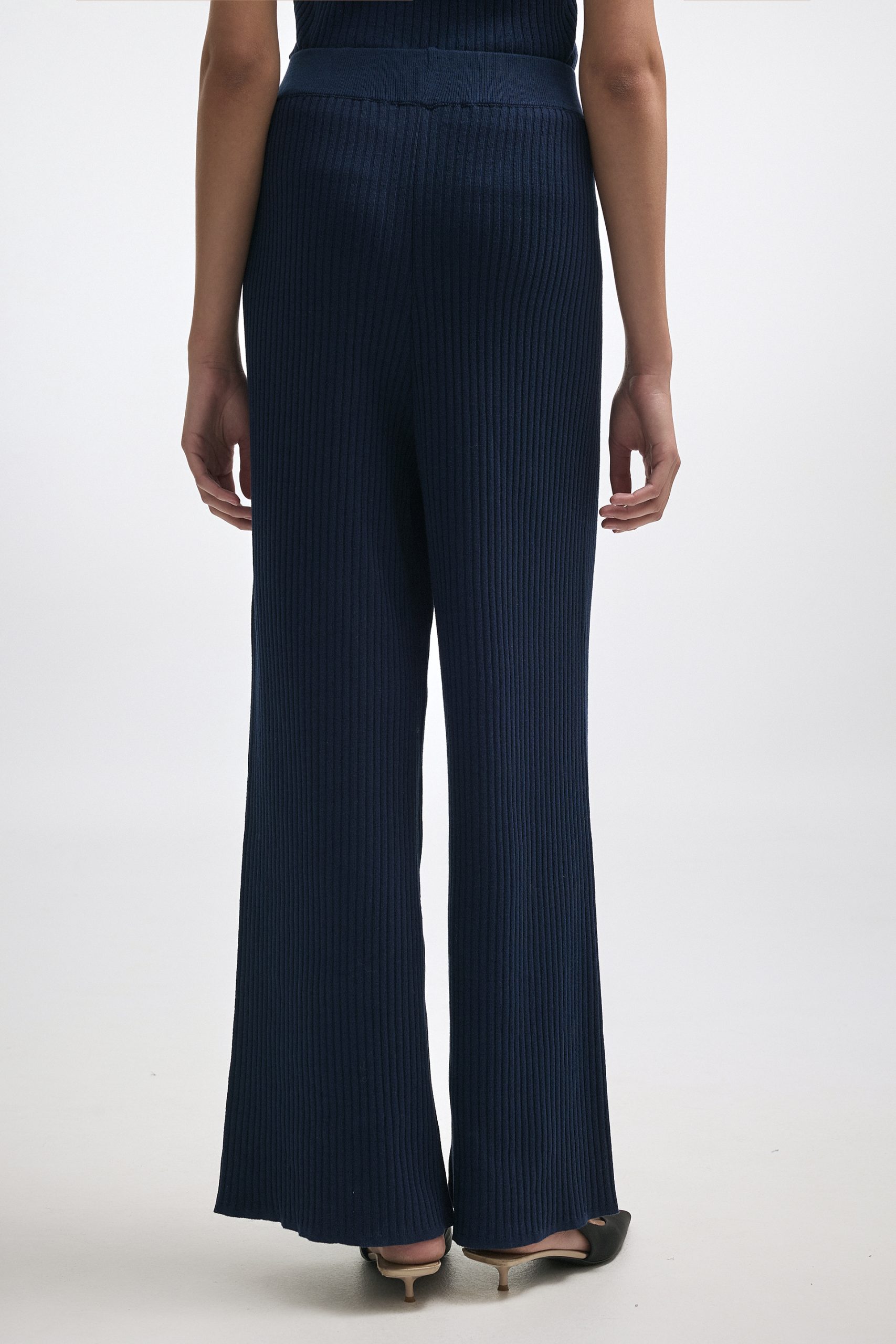 High-waisted trousers in a fine ribbed knit.Cut with a relaxed, elongated leg and a clean, straight fall.Finished with subtle contrast trim at the waistband and hem.Soft structure with fluid movement. Designed to sit effortlessly on the body.