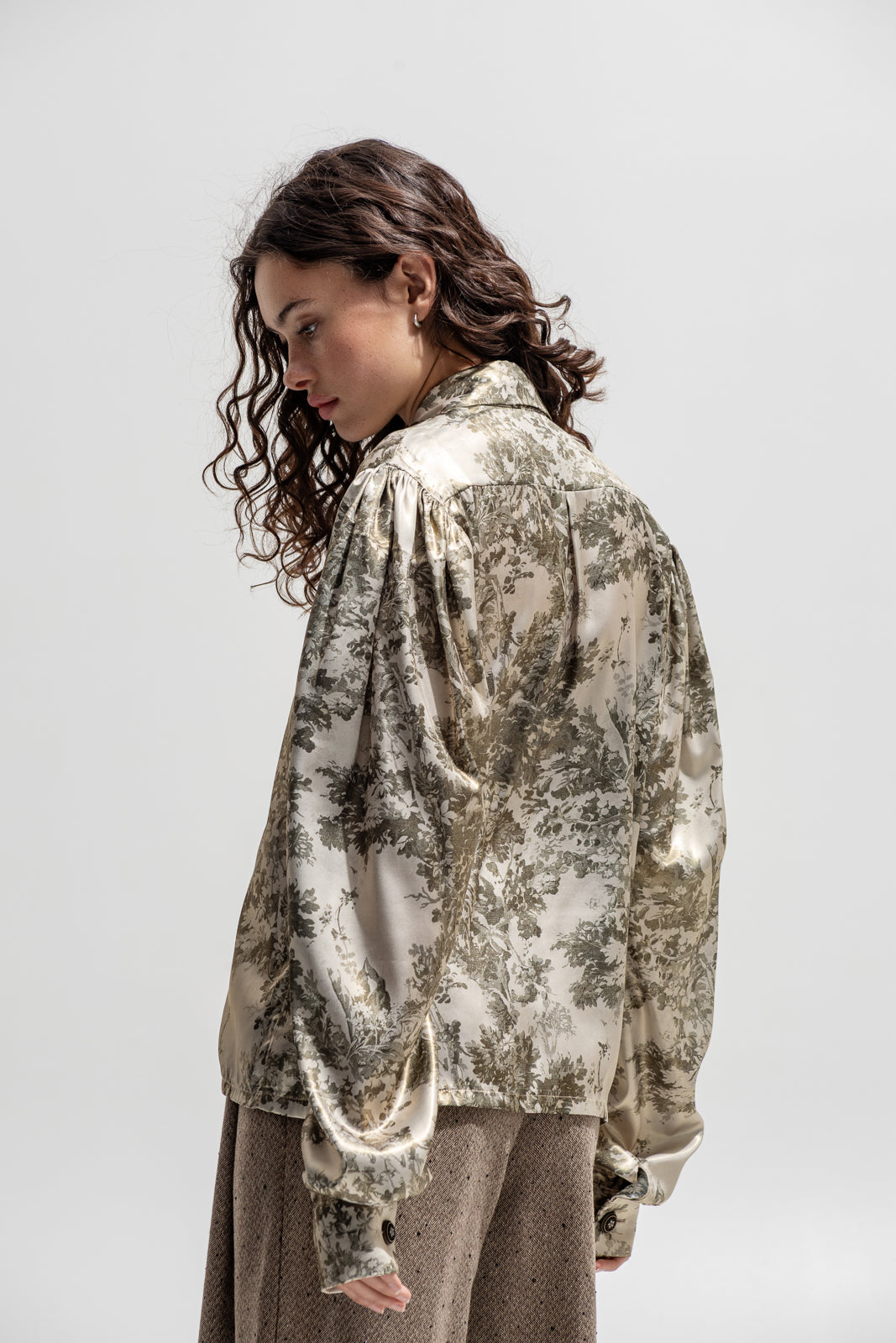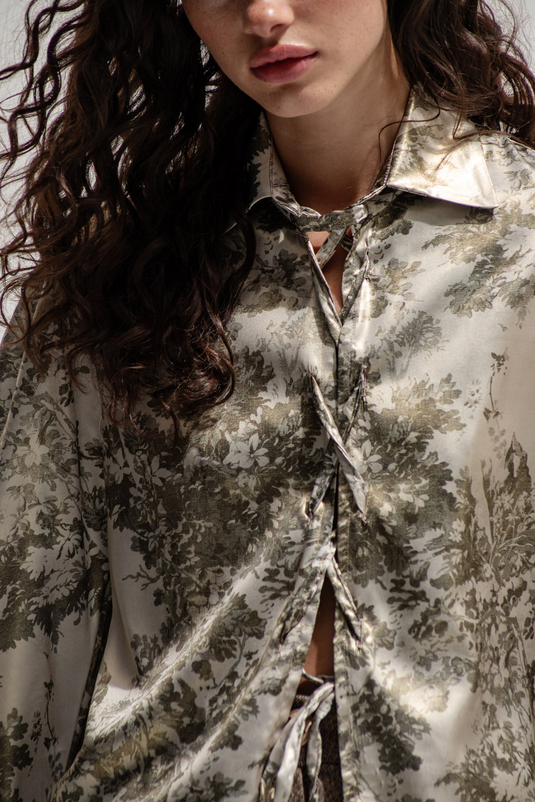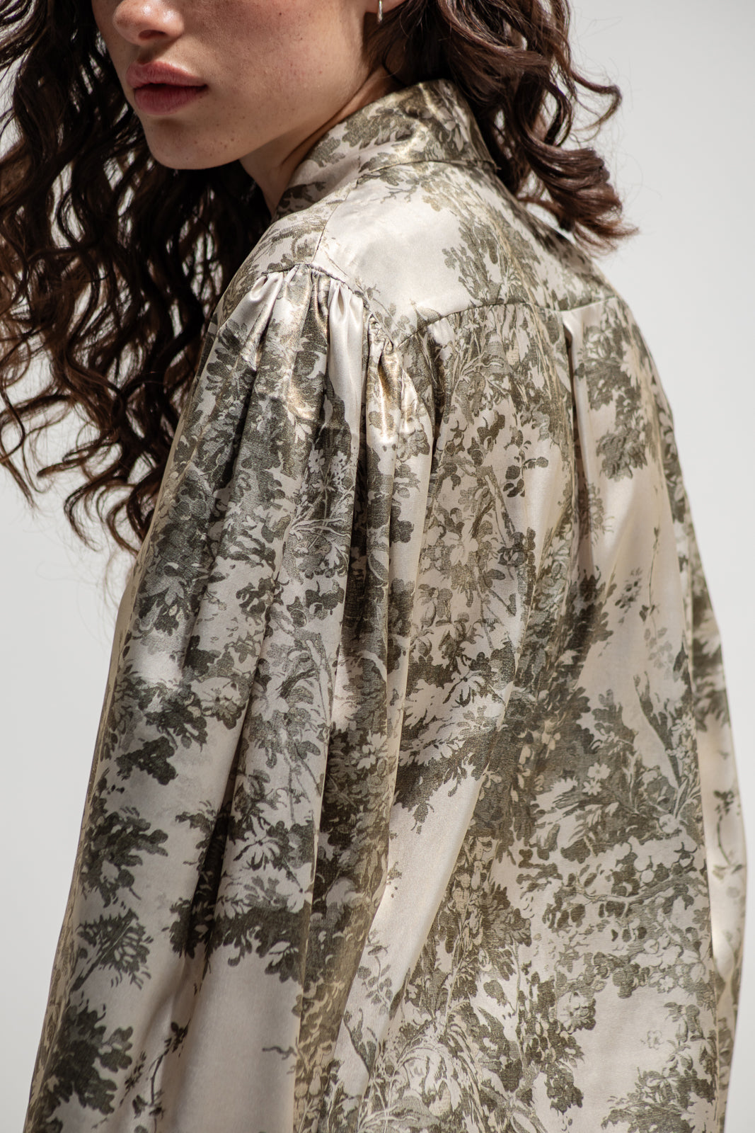 An elevated take on the classic shirt, reimagined in lustrous printed satin with a vintage-inspired pastoral motif. The soft sheen of the fabric catches the light beautifully, while the front tie closures and voluminous sleeves add a romantic yet effortless touch. Perfect worn open over a bralette or buttoned up for a polished look — from day layering to evening sophistication.