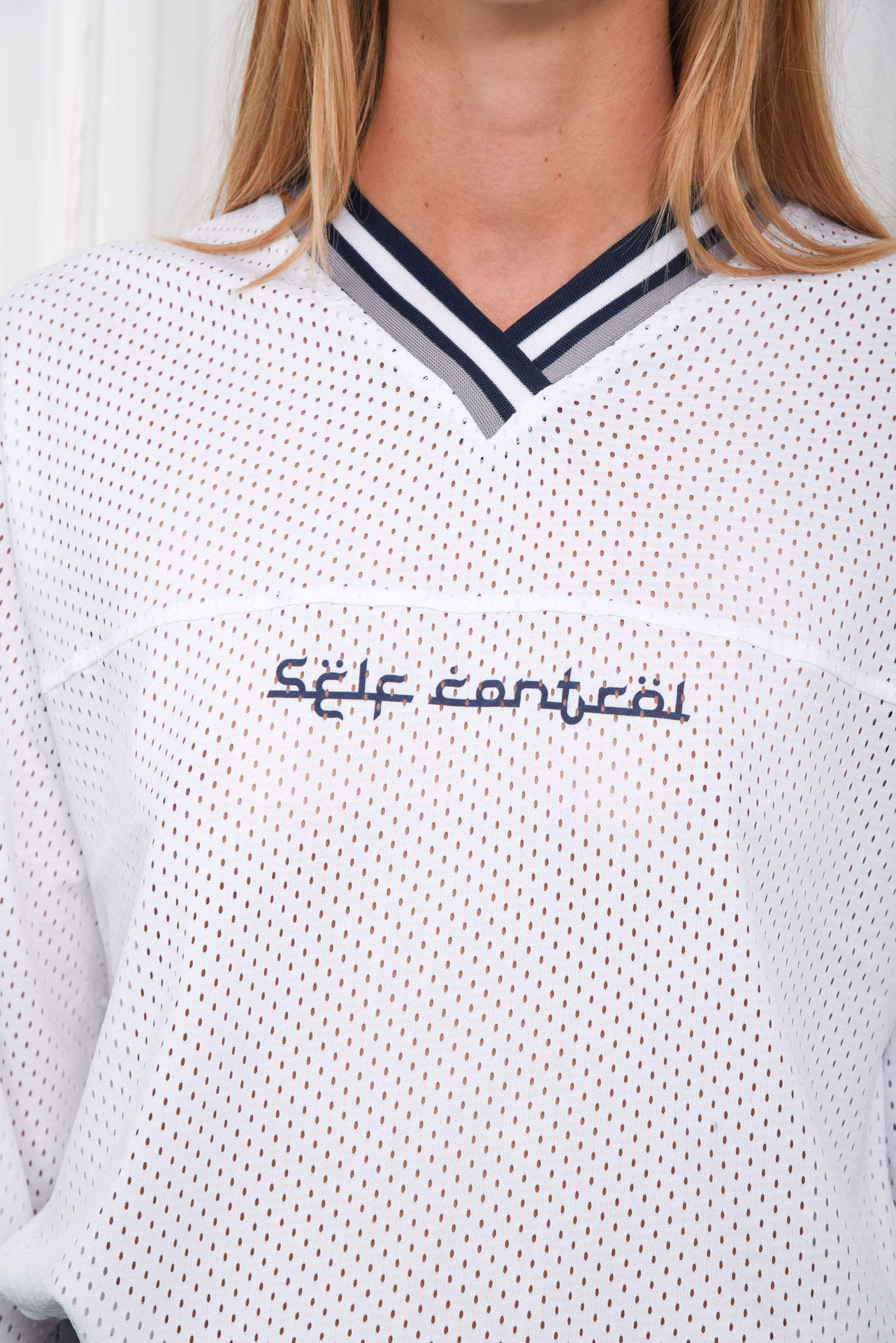 The Self Control long sleeve mesh blouse is made from lightweight white mesh with a breathable perforated texture. It features a sporty V-neckline with striped trim in navy and grey, and a “Self Control” stamp on the chest. With long sleeves, side slits, and a relaxed fit, it’s perfect for layering or wearing solo.