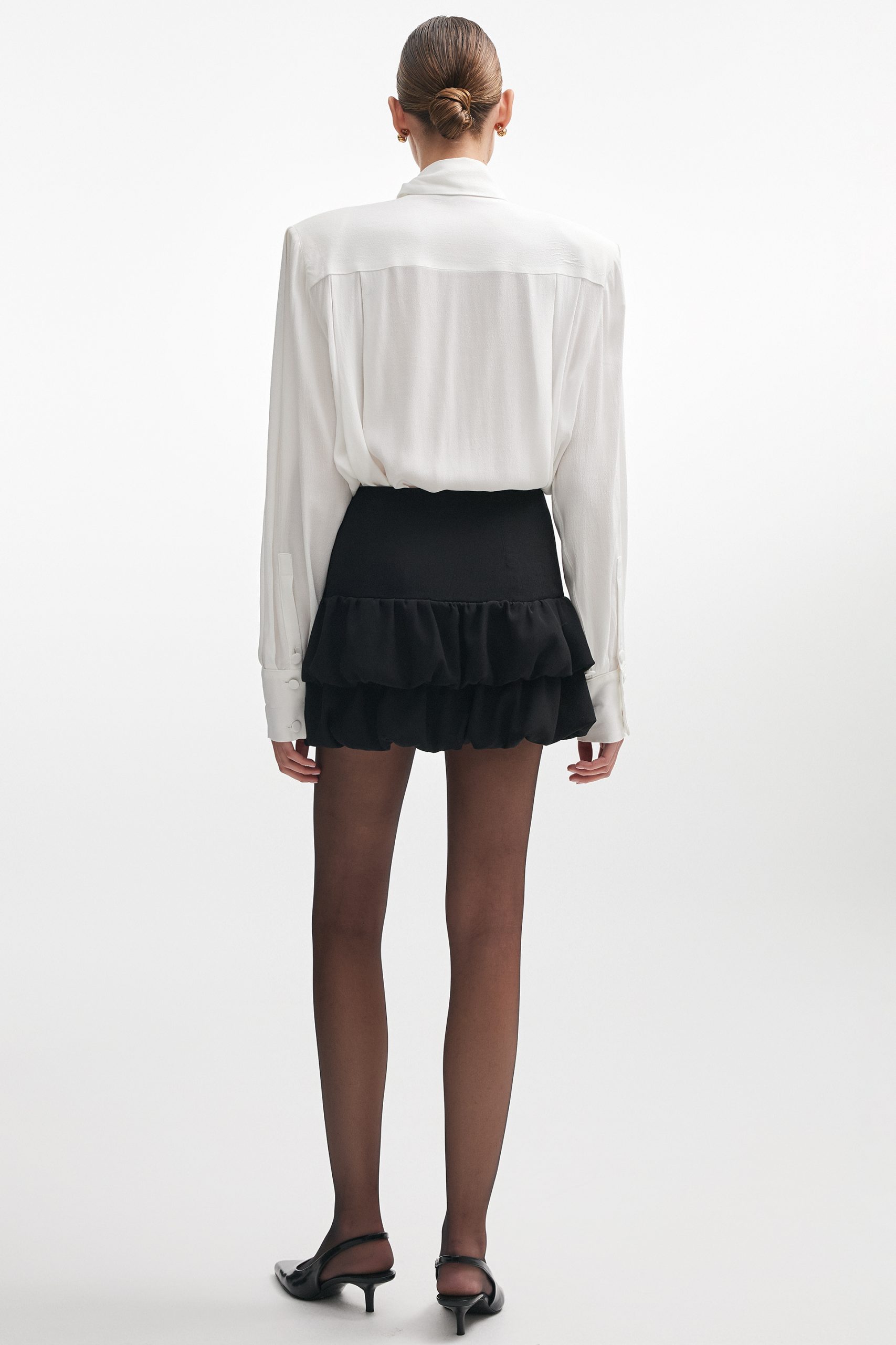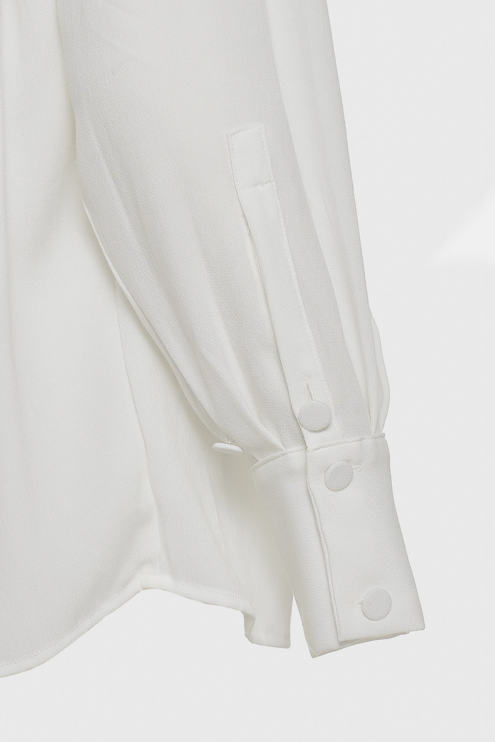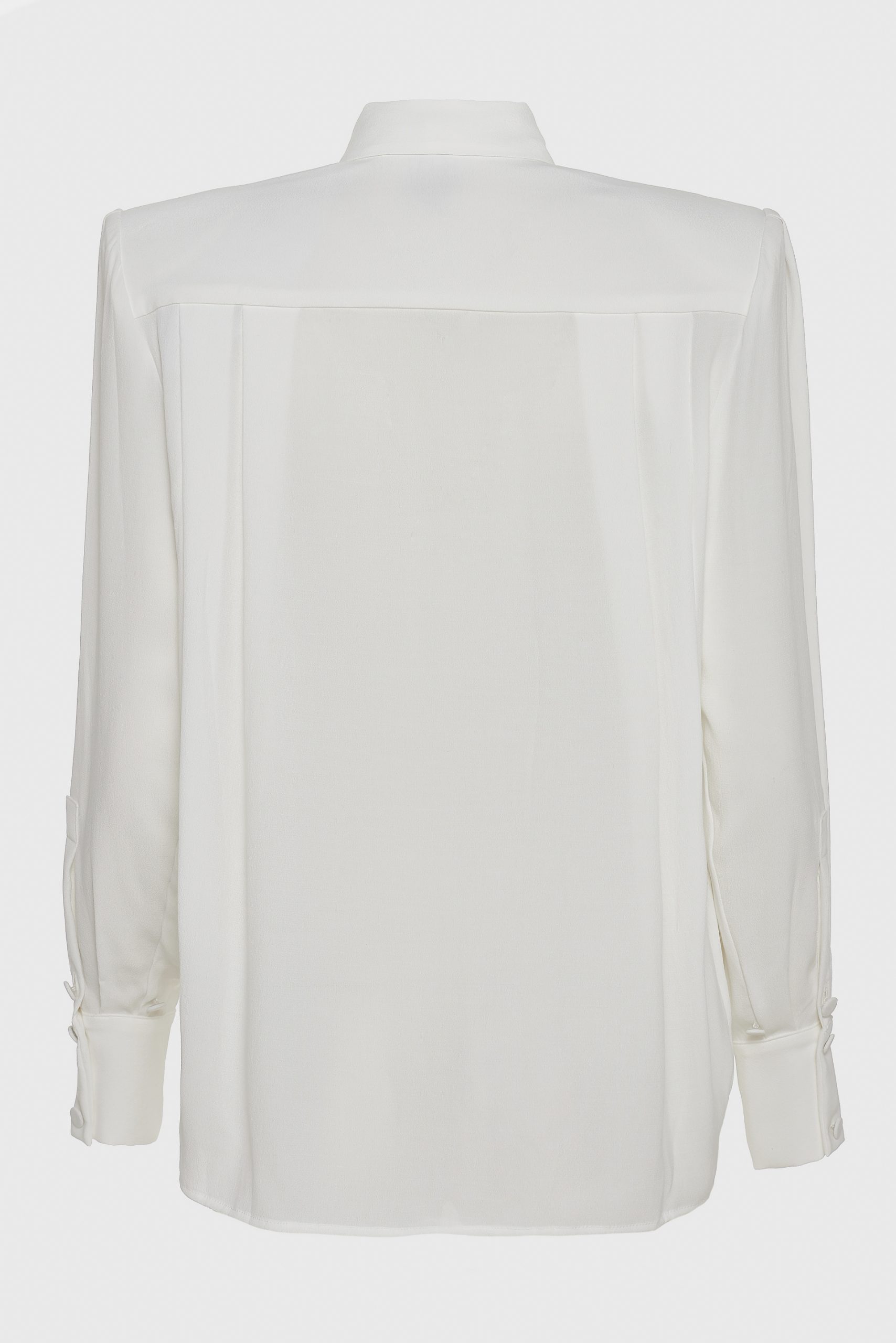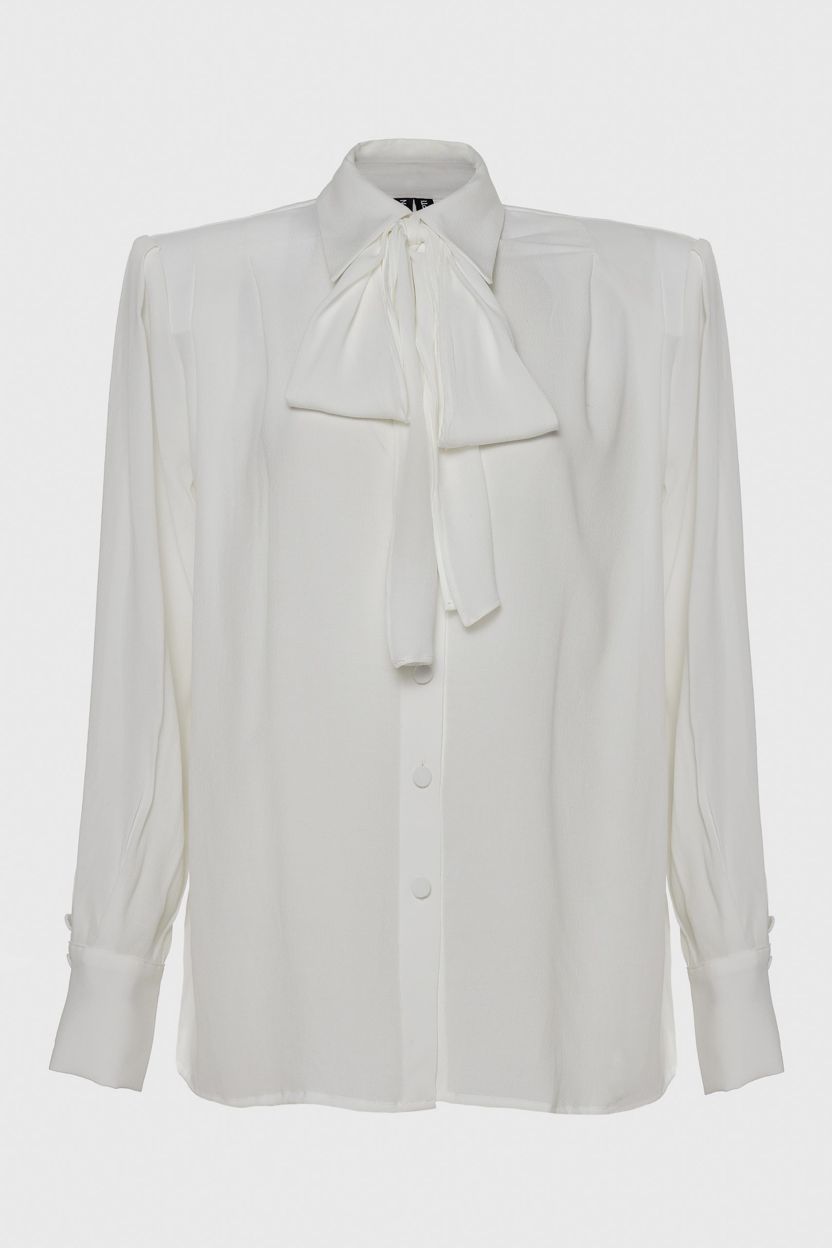 An elegant blouse crafted from a soft rayon-viscose blend, featuring fine pleats and a statement bow tie at the neck. Its fluid drape and lightweight texture make it a refined choice for both day and evening looks effortlessly balancing femininity and sophistication.