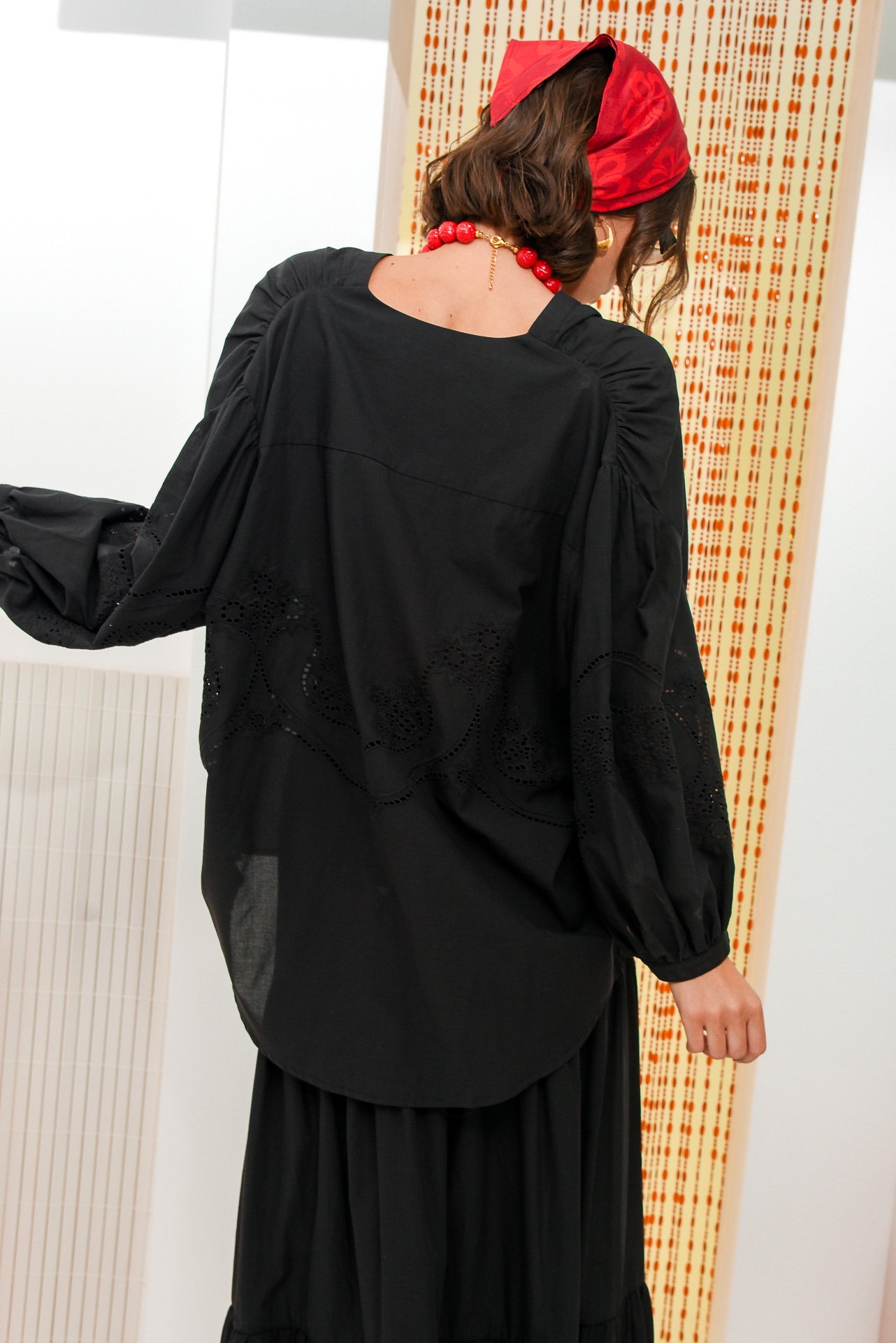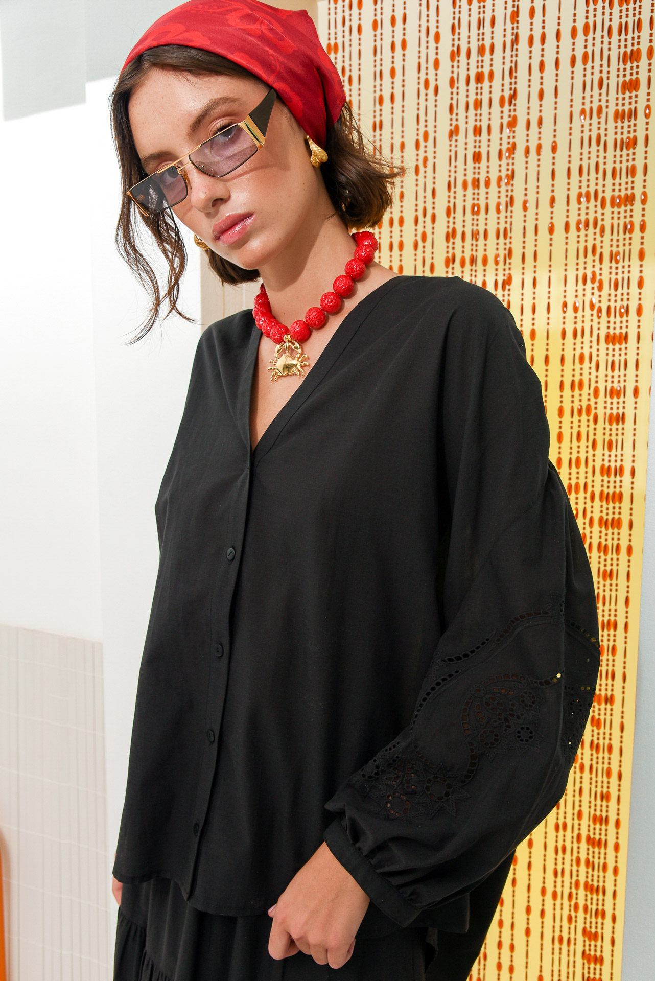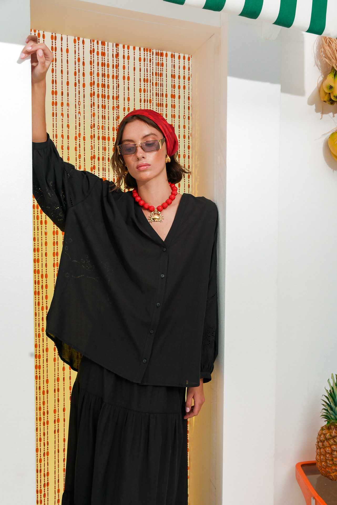 The Soursop shirt is made from crisp cotton with a loose, airy fit. It has a V-neckline, 3/4 sleeves with gathered cuffs, and eyelet embroidery on the sleeves and back. The front buttons down for easy wear. Light, breathable, and detailed—ideal for warm-weather outfits.