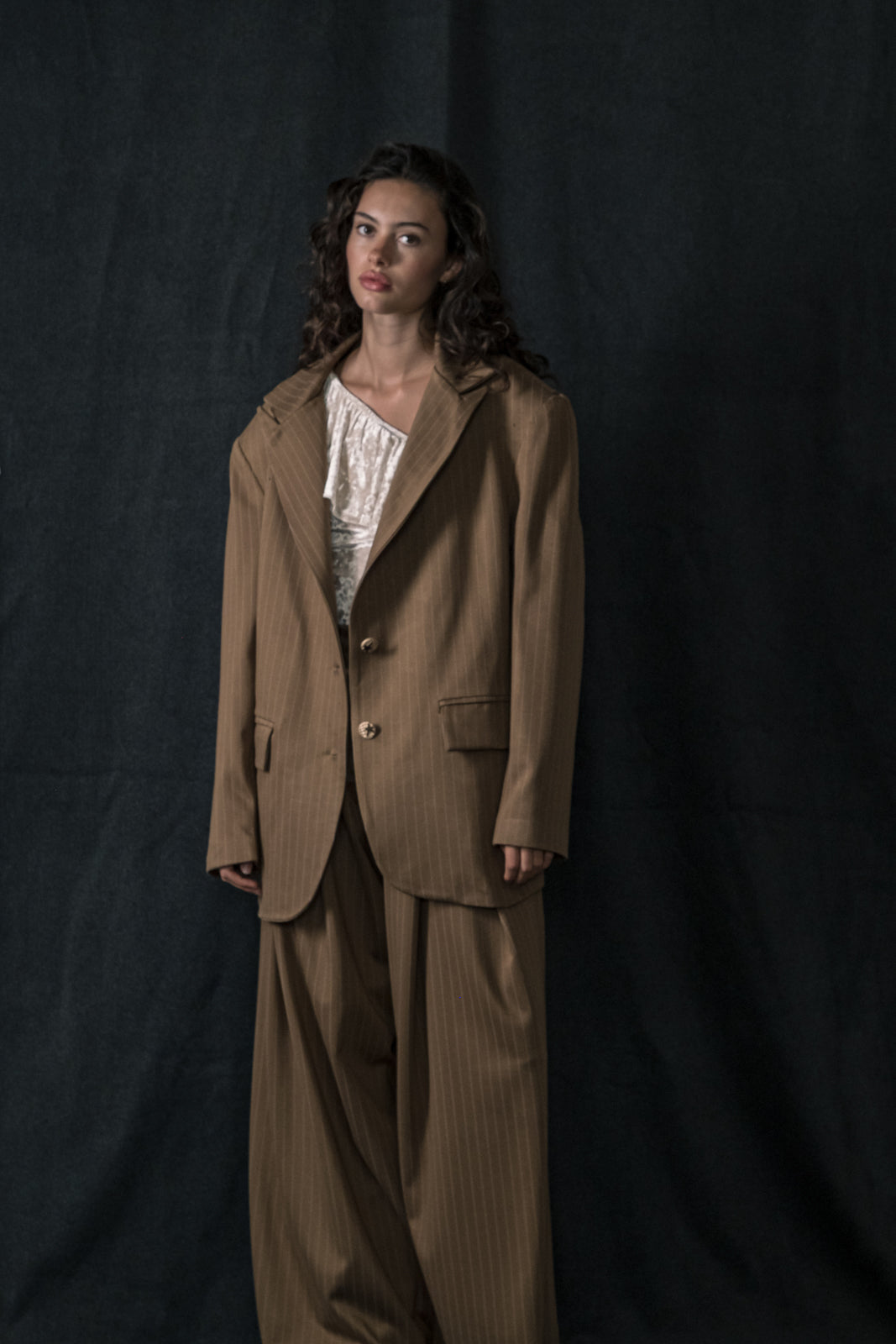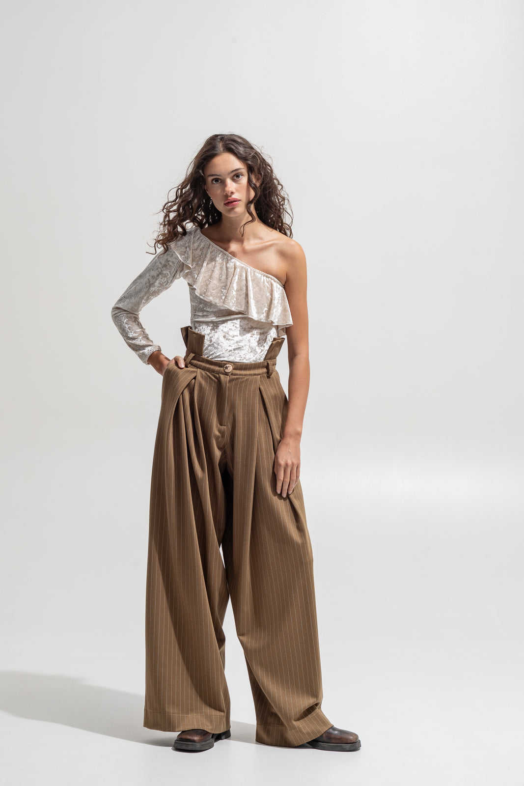 Make a bold entrance with these high-waist wide-leg pants in olive green with subtle pinstripes. Designed with exaggerated pleats and a sculptural waistband detail, they bring drama and sophistication to every look. The flowing, oversized silhouette ensures effortless movement while elongating the figure, making them the ultimate statement piece for modern power dressing.