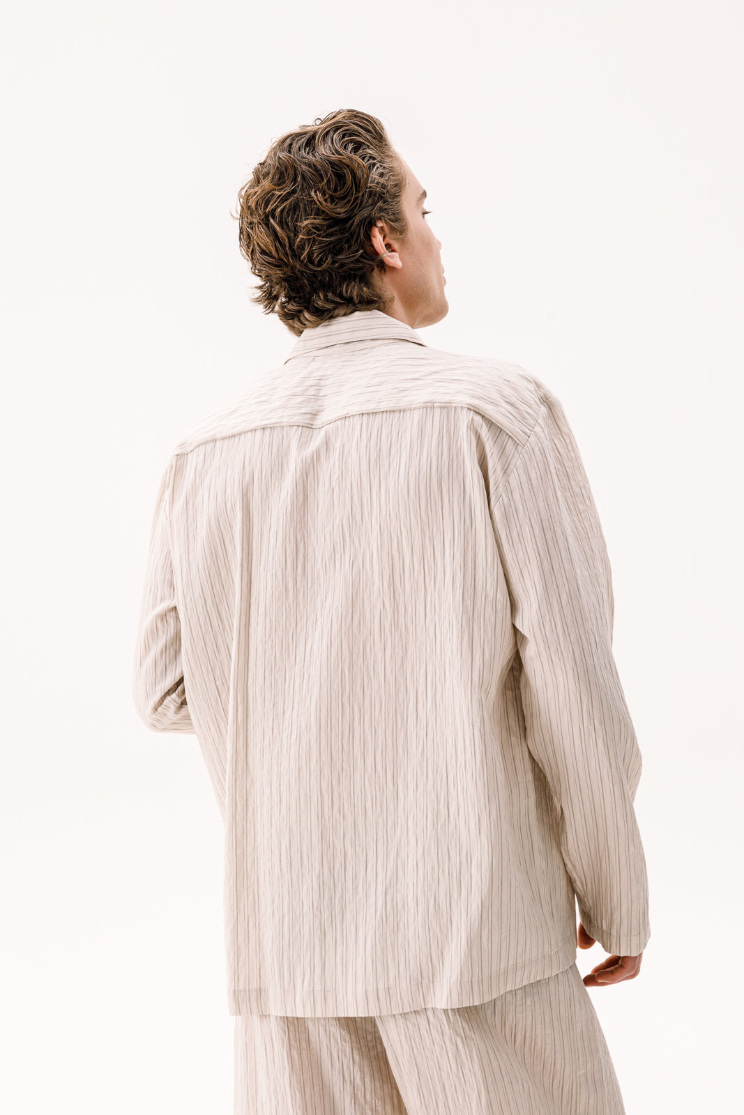 Tempest Shirt in Striped Beige. Crafted with exquisite attention to detail, this shirt embodies the tranquility of a summer breeze. The soft fabric and tailored fit ensure both comfort and style, making it a versatile addition to any wardrobe. With its subtle elegance and soothing hue, the Tempest Shirt is perfect for adding a touch of serenity to your ensemble. Dive into effortless sophistication with Dante Menswear.