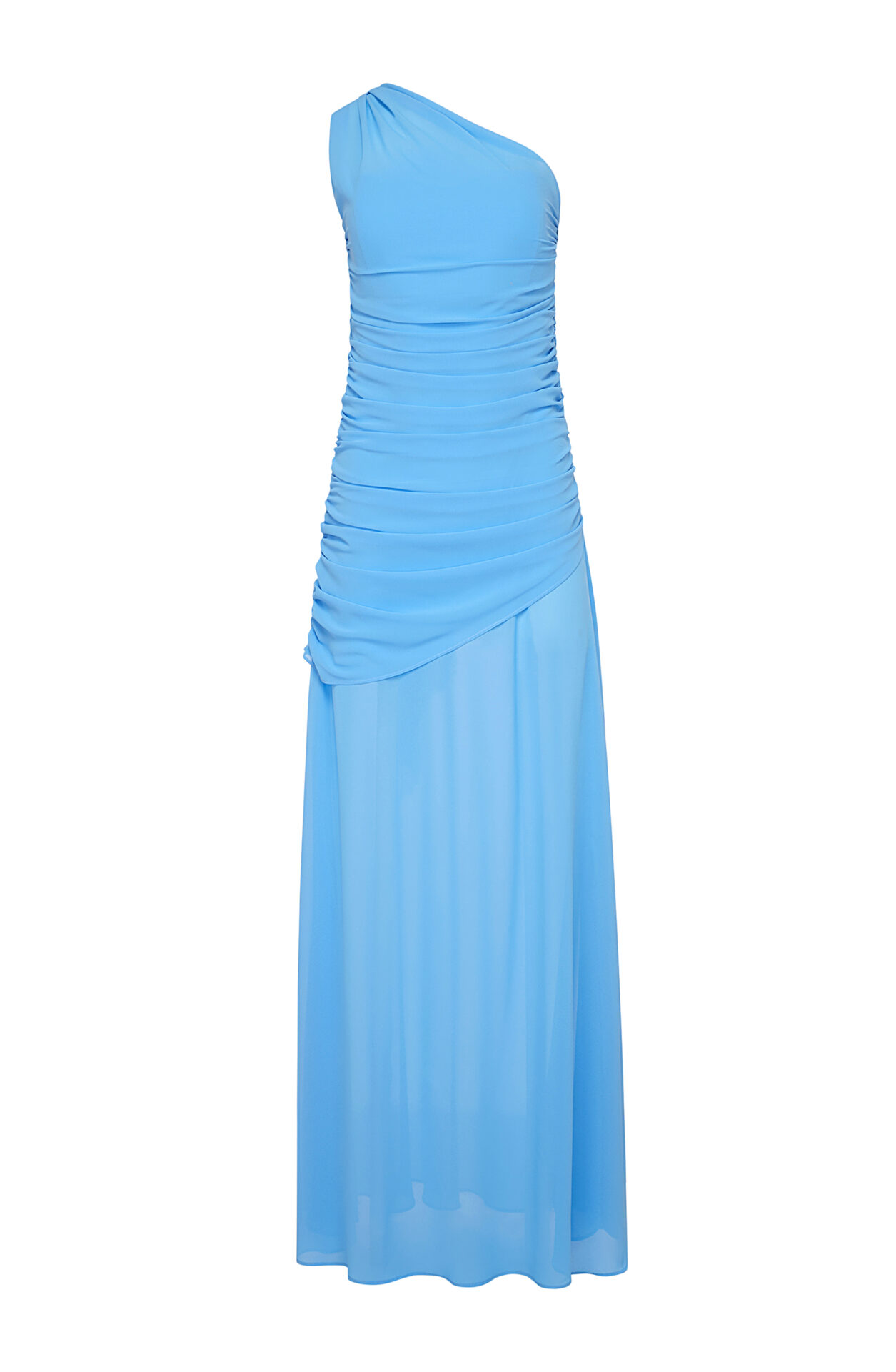 - A maxi one-shoulder gown with draping details & a shoulder cape.