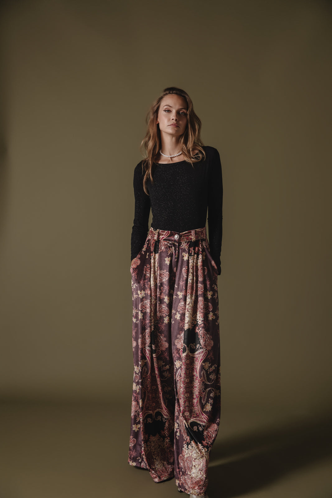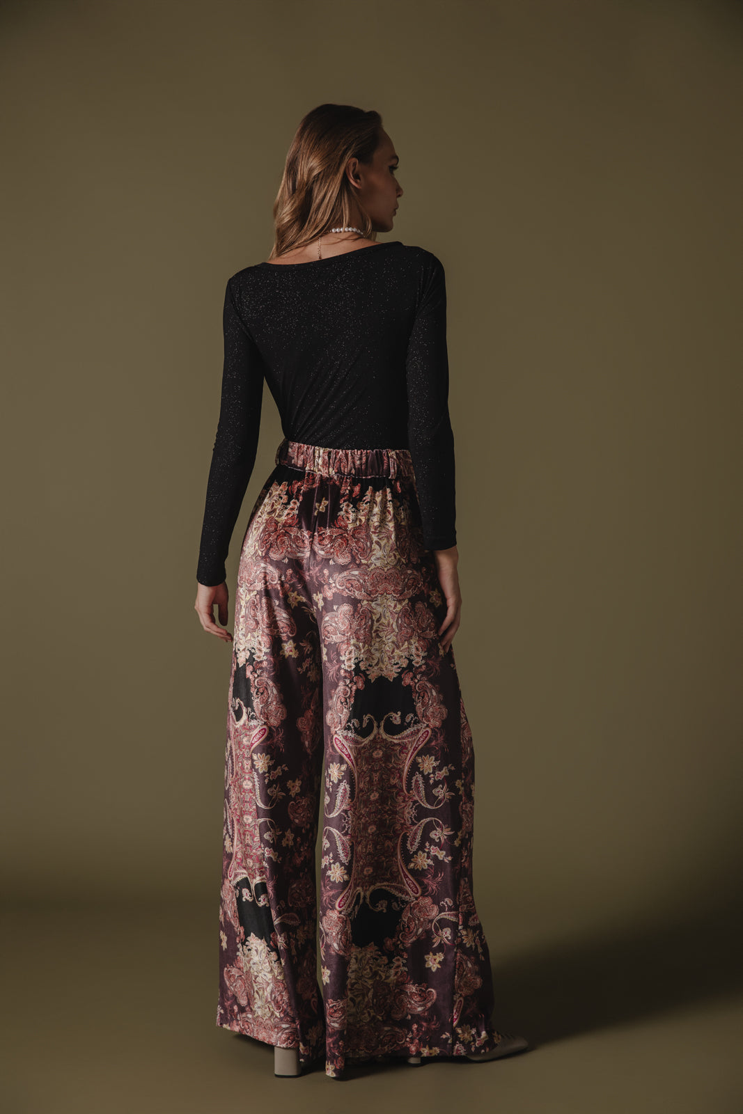 • Προσθέστε μια πινελιά δραματικότητας, με αυτό το πολυτελές, βελούδινο παντελόνι με φαρδύ πόδι, επιδεικνύοντας μια εκπληκτική στάμπα εμπνευσμένη από το μπαρόκ σε πλούσιες αποχρώσεις του μπορντό, του μαύρου και του χρυσού.
