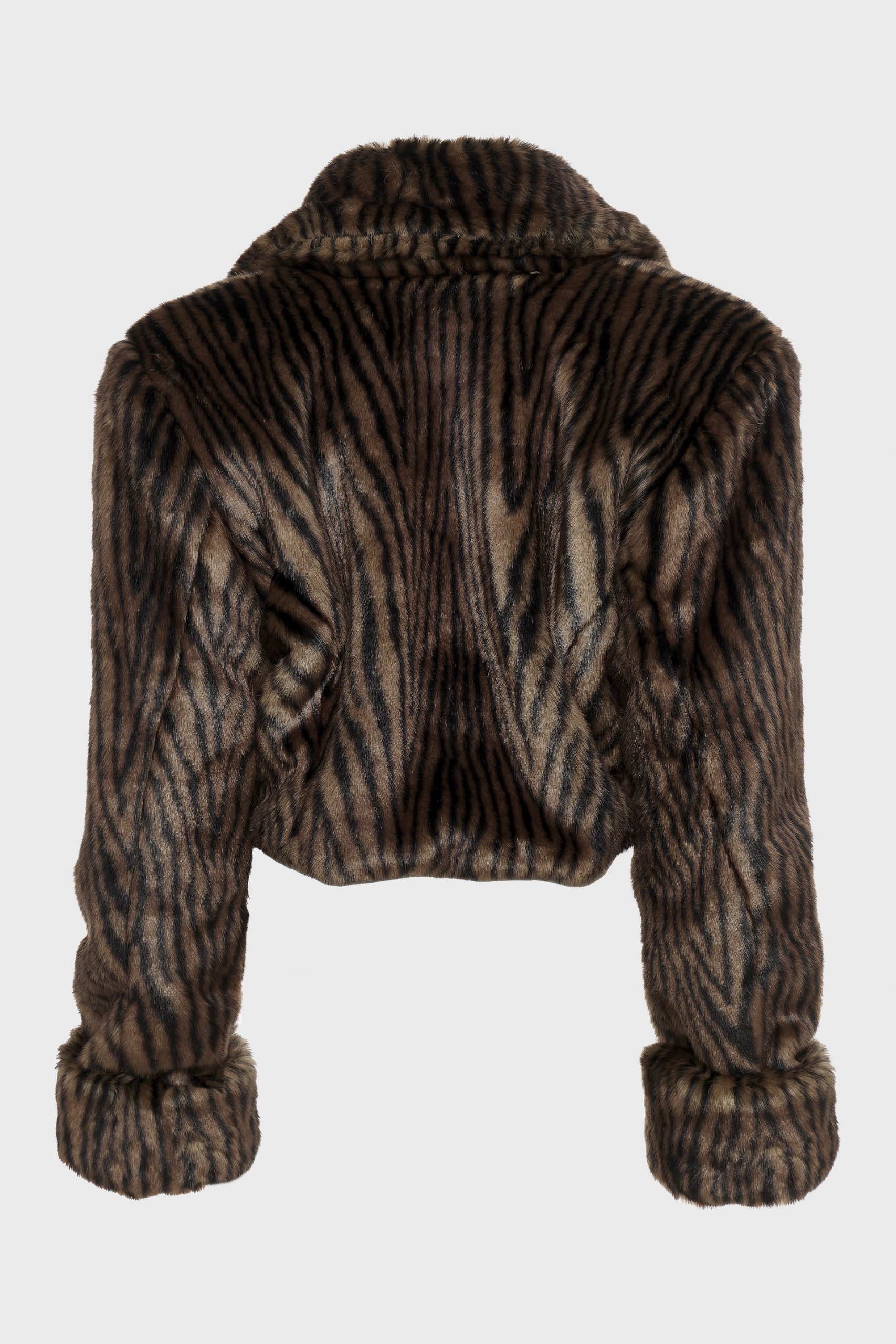 A nostalgic yet modern faux-fur jacket that brings instant statement style to any look. Its plush texture, cropped cut and structured shoulders add a bold, feminine silhouette, while maintaining a cozy and soft feel. Perfect for elevating your evening outfits or adding a glamorous twist to your everyday wardrobe. Crafted from high-quality faux fur for a luxurious look with ethical appeal.