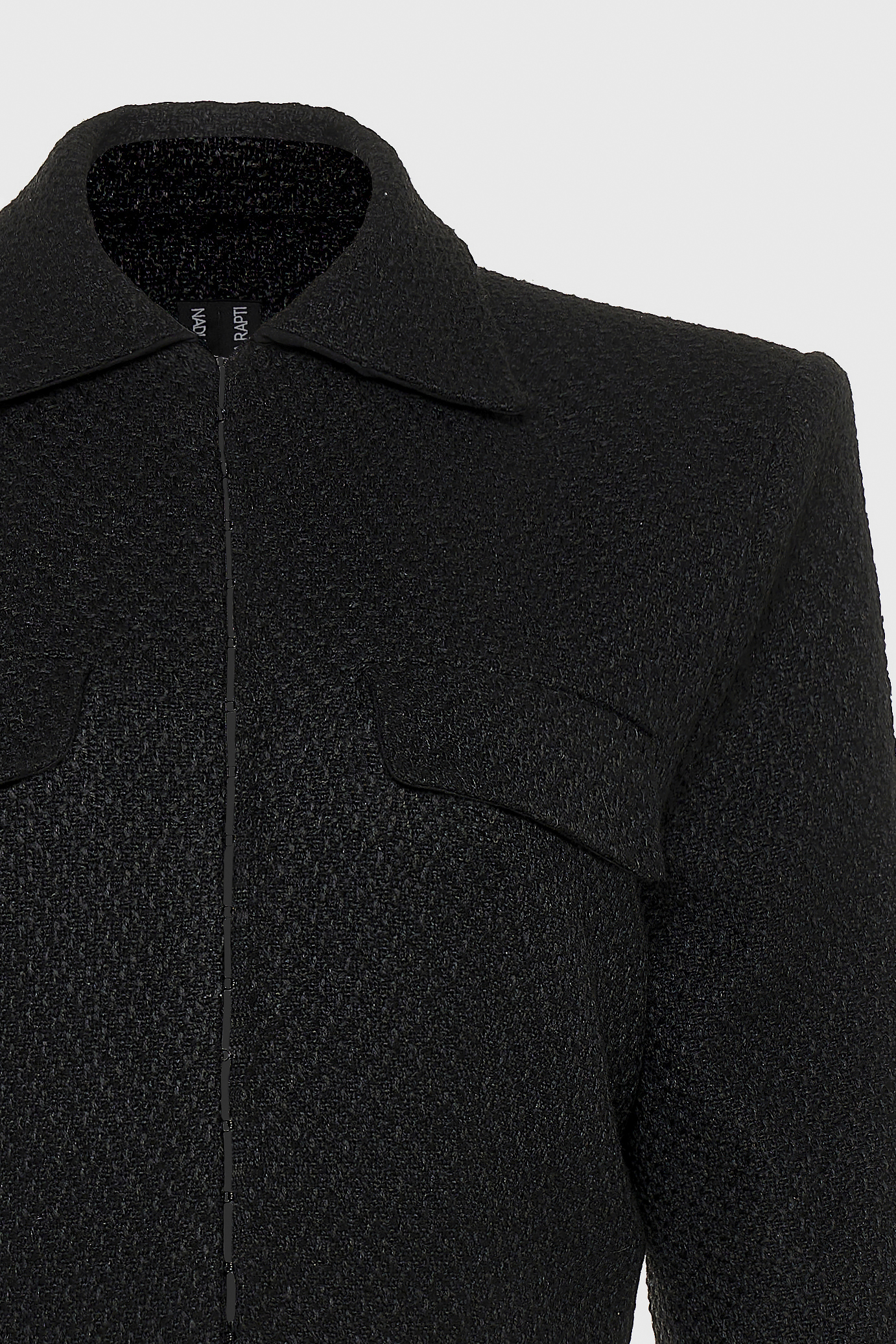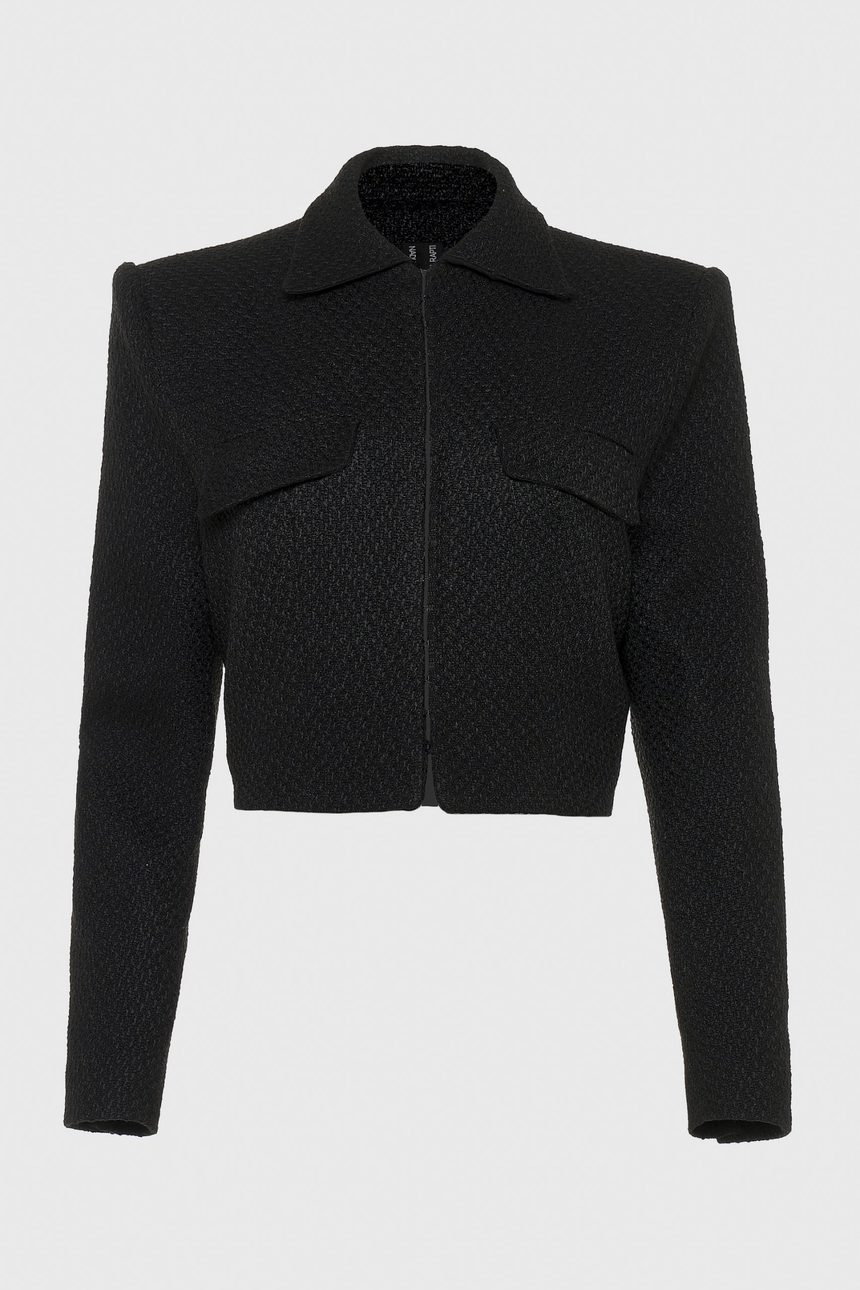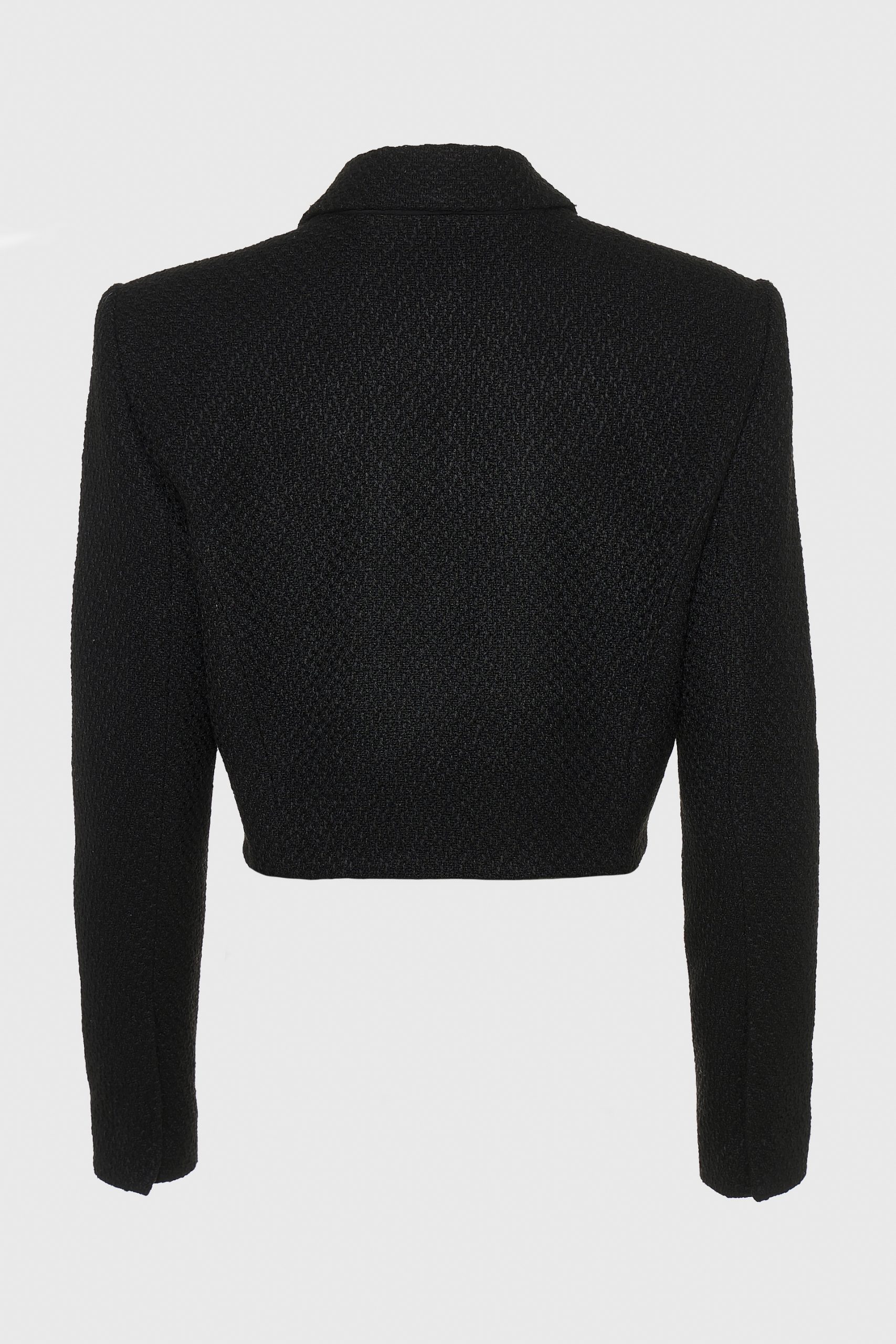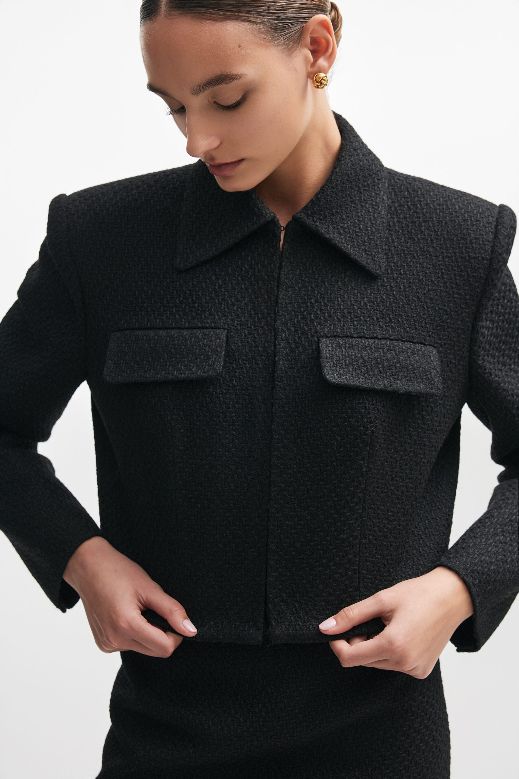A sharply tailored cropped blazer crafted from refined tweed fabric. Its structured silhouette and clean lines create a modern, elevated look perfect for pairing with the matching Tokyo Skirt or Mini Dress for a polished, coordinated ensemble. A statement piece that brings sophistication to every outfit.