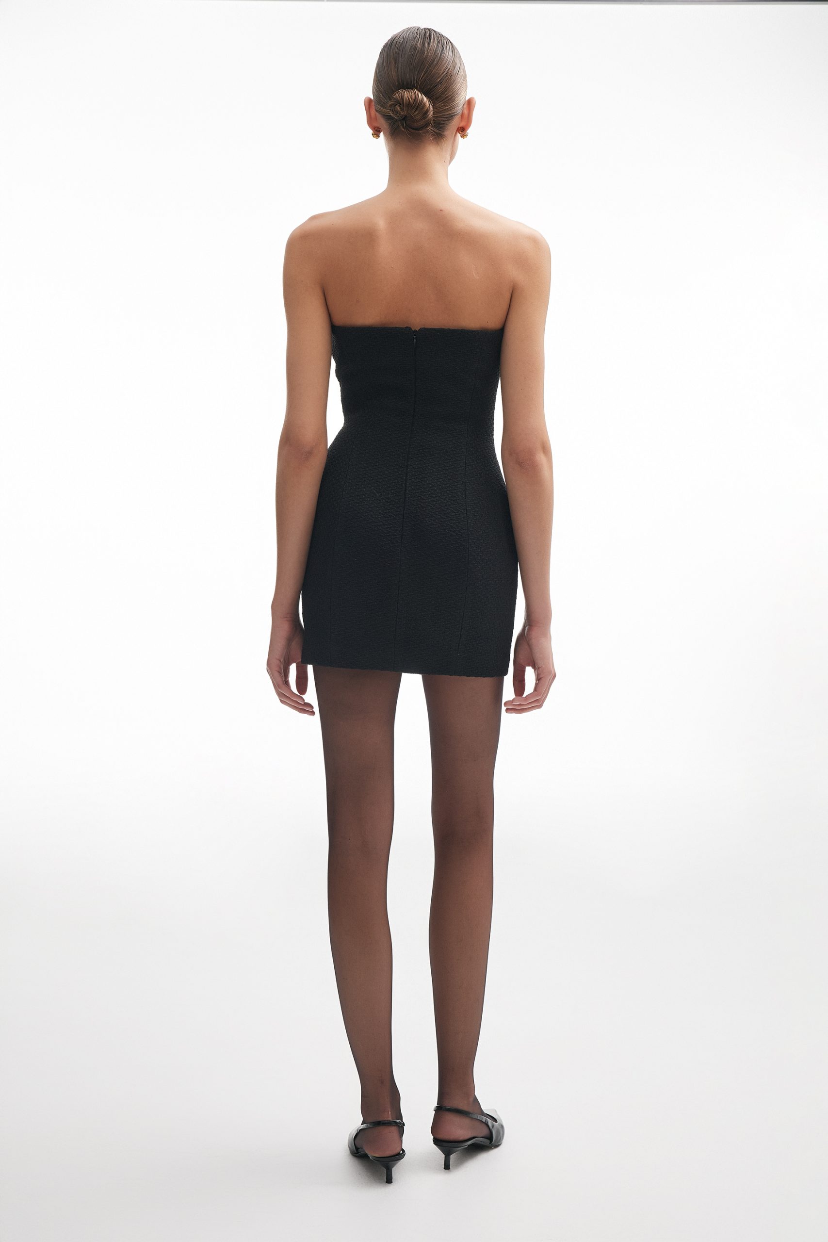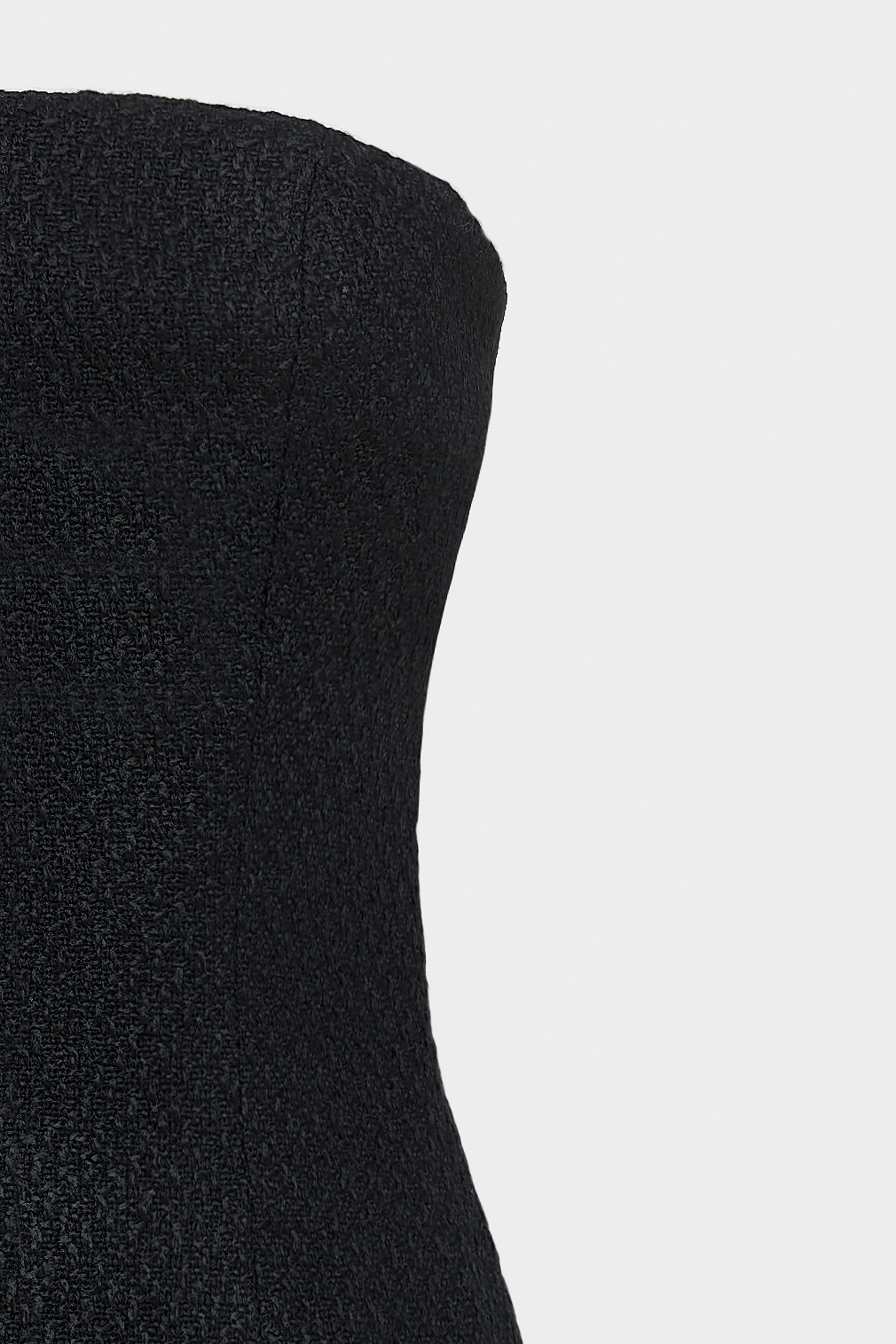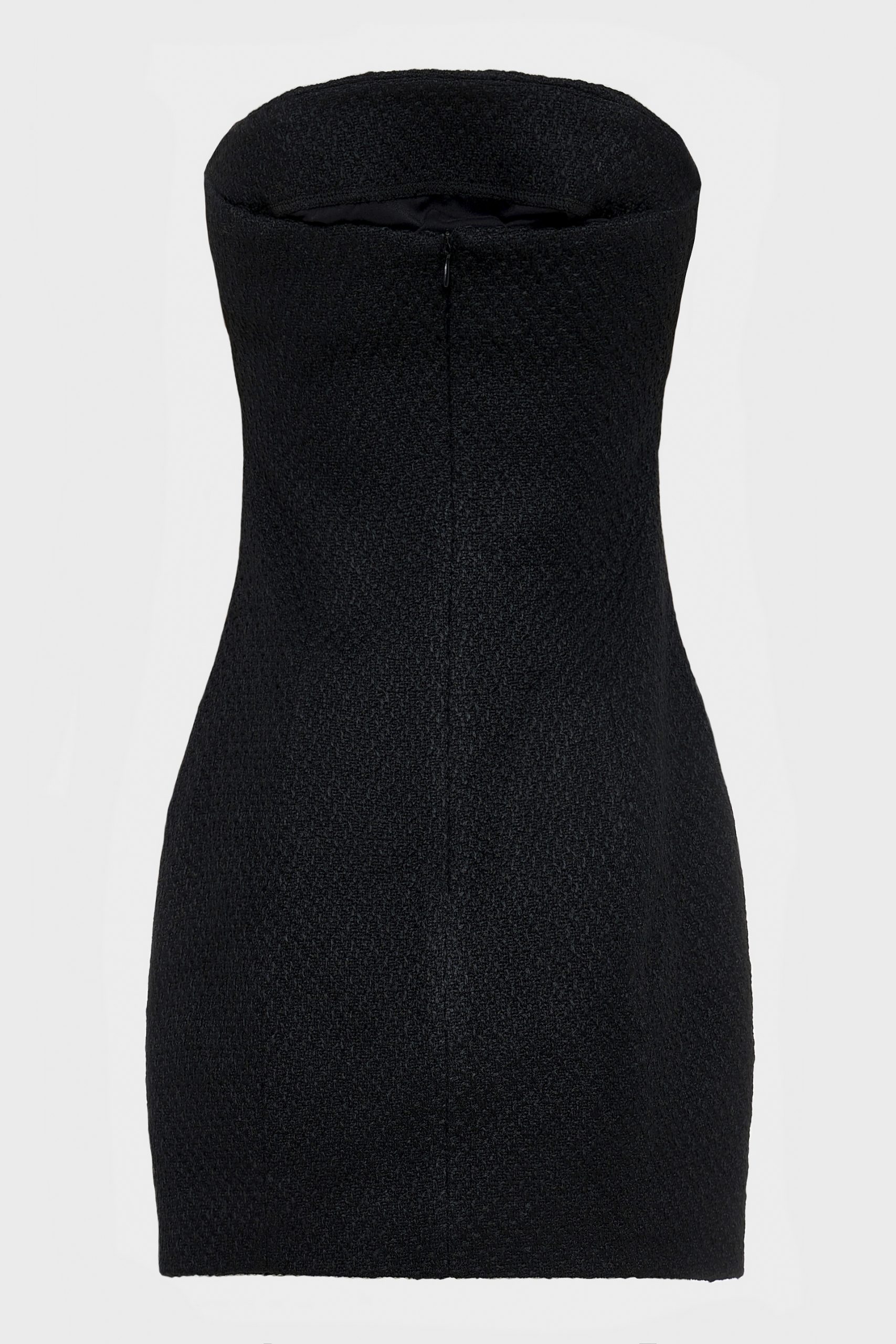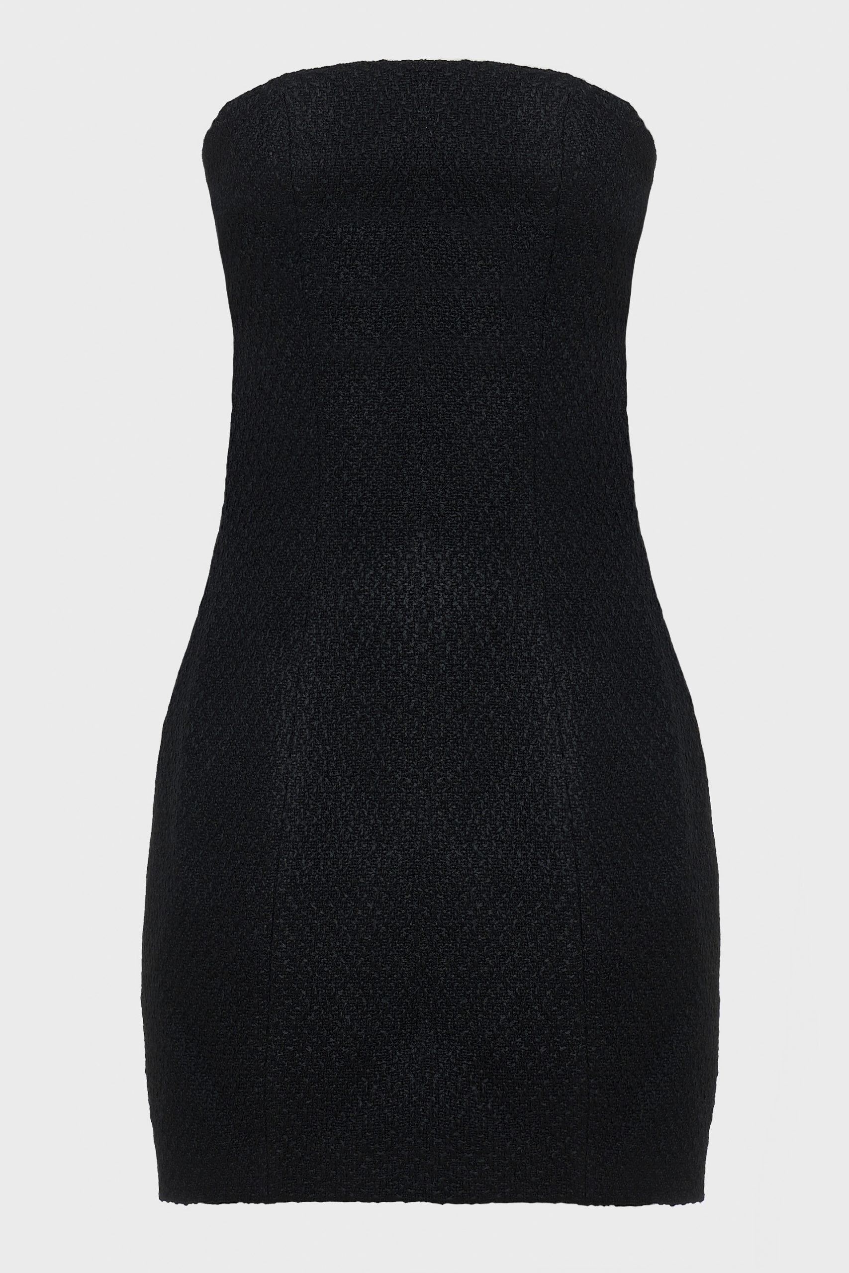 A strapless mini dress crafted from rich tweed fabric. Its structured silhouette highlights the figure with effortless elegance, offering a timeless yet contemporary look, perfect for evening occasions or elevated city style.