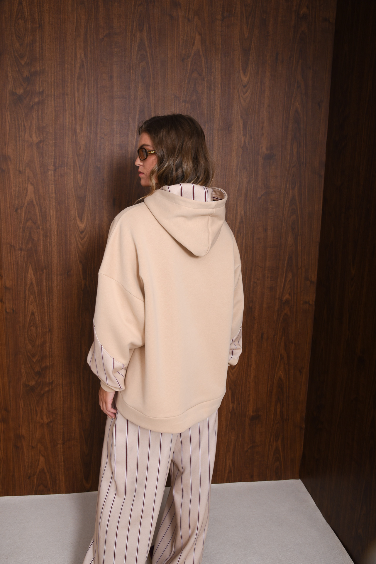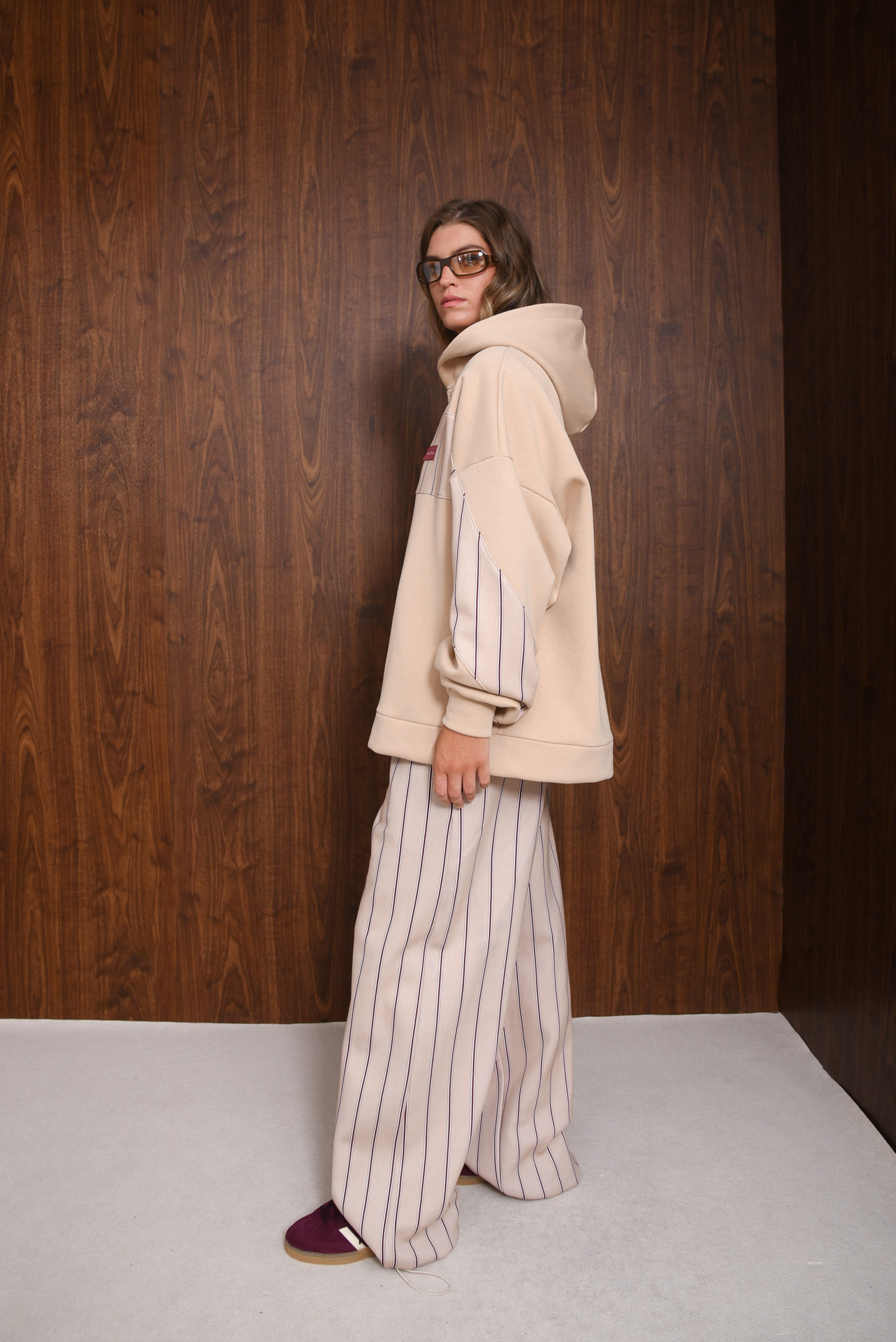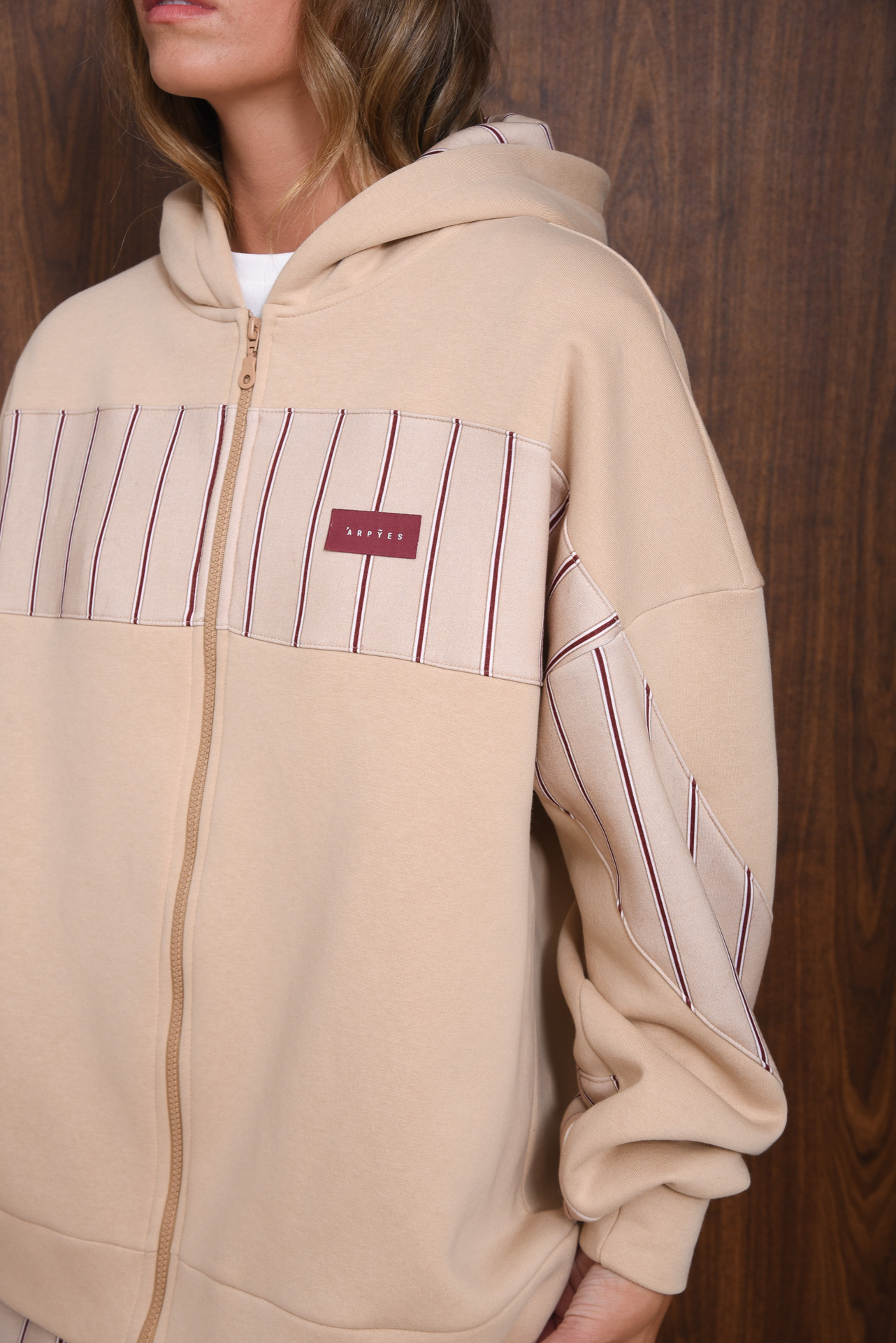 The True Cardigan is an oversized zip-up hoodie made from soft cotton. It features striped panels across the chest and sleeves, a roomy hood, dropped shoulders, and ribbed cuffs. Designed with a front ARPYES logo patch and relaxed fit, it combines comfort and style for everyday wear.