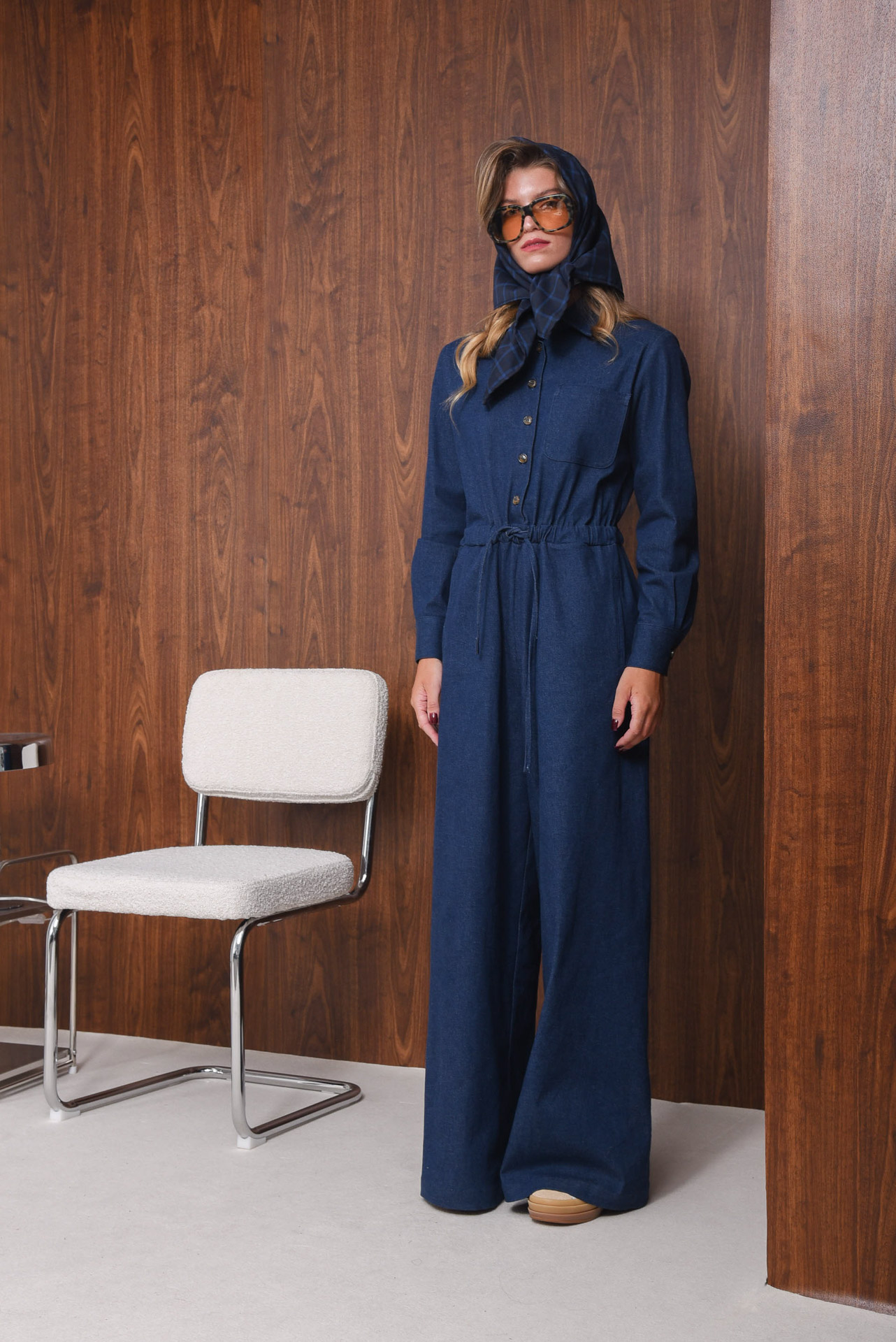 The Trust jumpsuit is crafted in dark blue denim with a relaxed, wide-leg fit. It features a classic shirt collar, button-up front, long sleeves with buttoned cuffs, and a single chest pocket. The adjustable drawstring waist adds shape, while side pockets bring functionality. Designed to keep you stylish and comfortable with no effort.