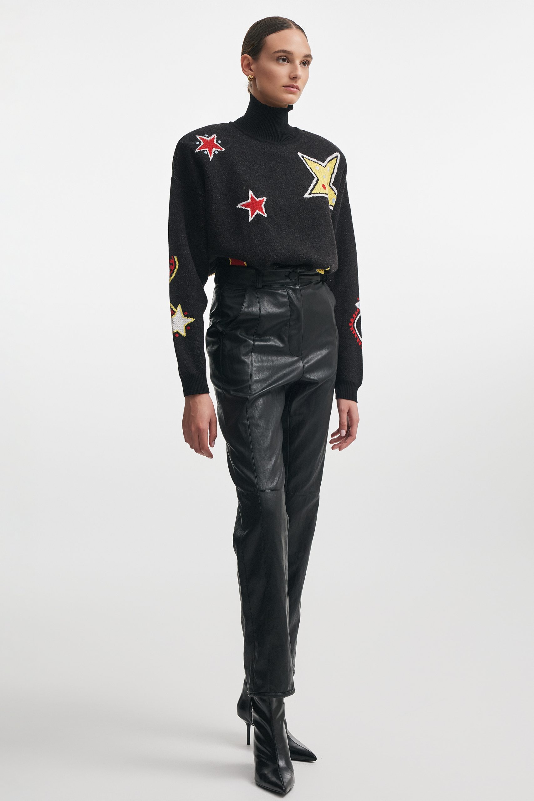 Cut with a clean, elongated line, these high-rise trousers are crafted from soft faux leather with a structured yet flexible hand. The silhouette sits neatly at the waist and falls straight through the leg, offering an effortless, quiet refinement. Finished with subtle topstitch detailing and a minimal waistband for a precise fit.