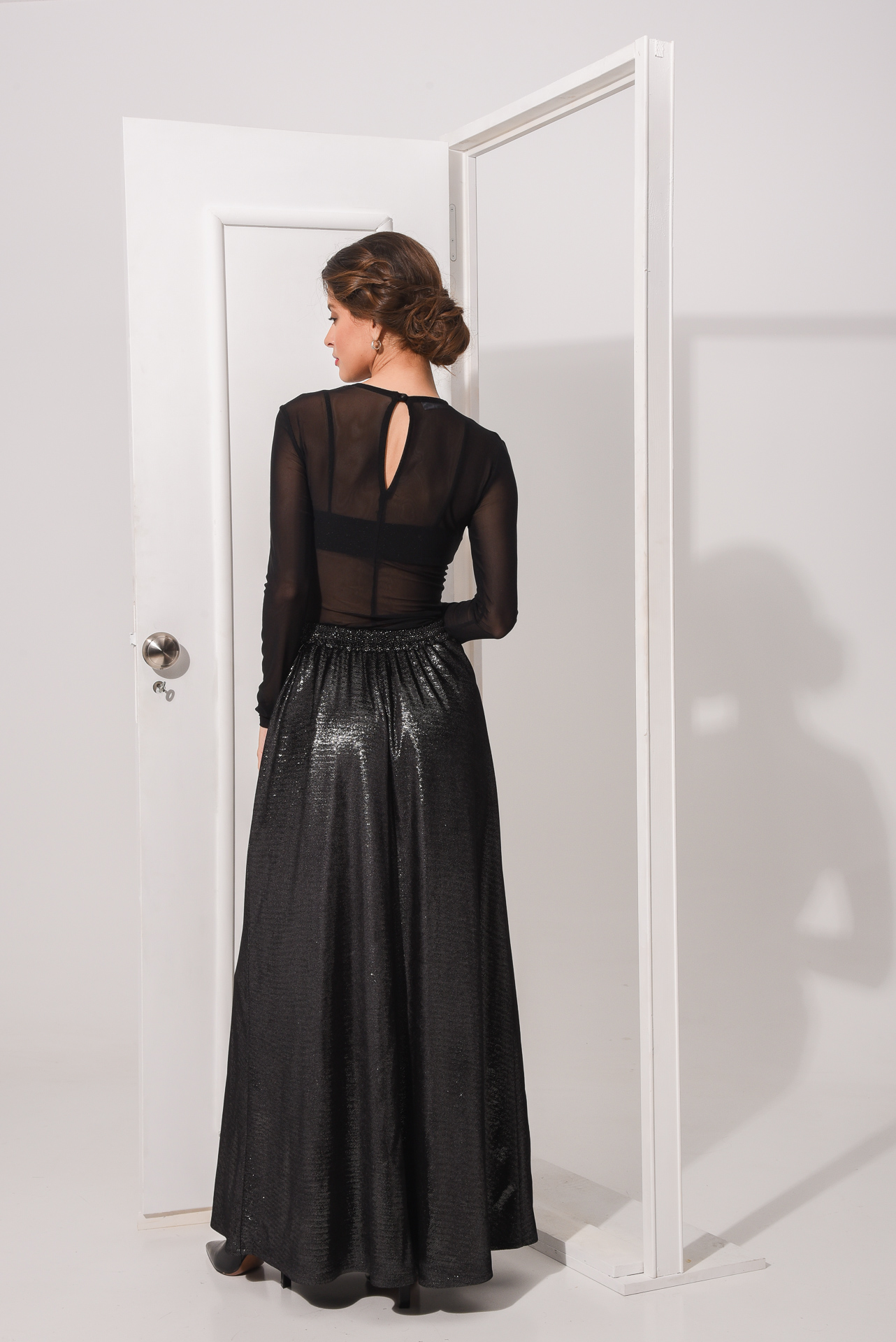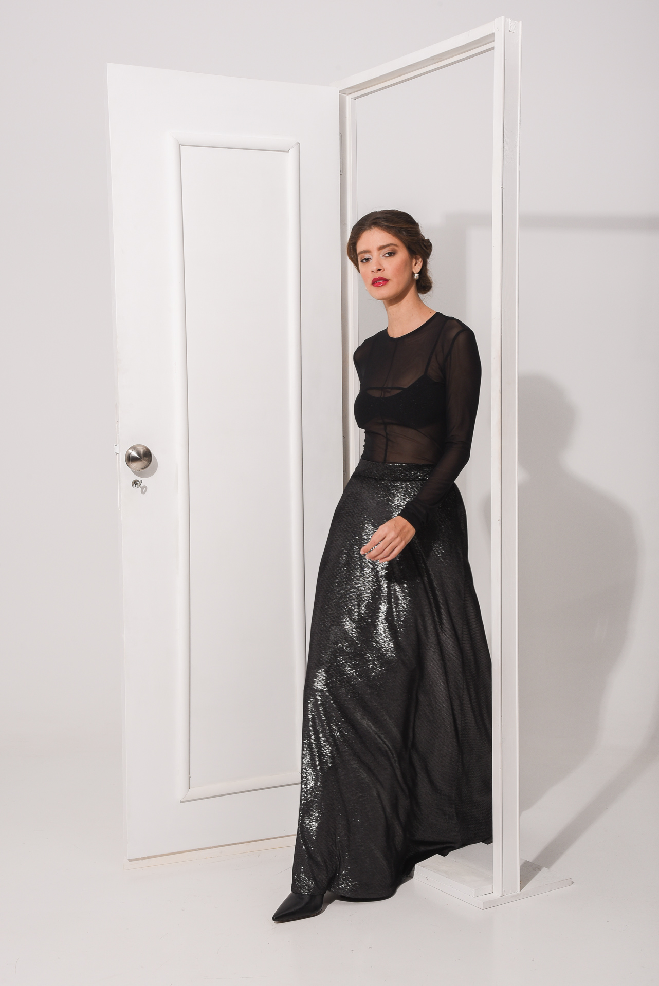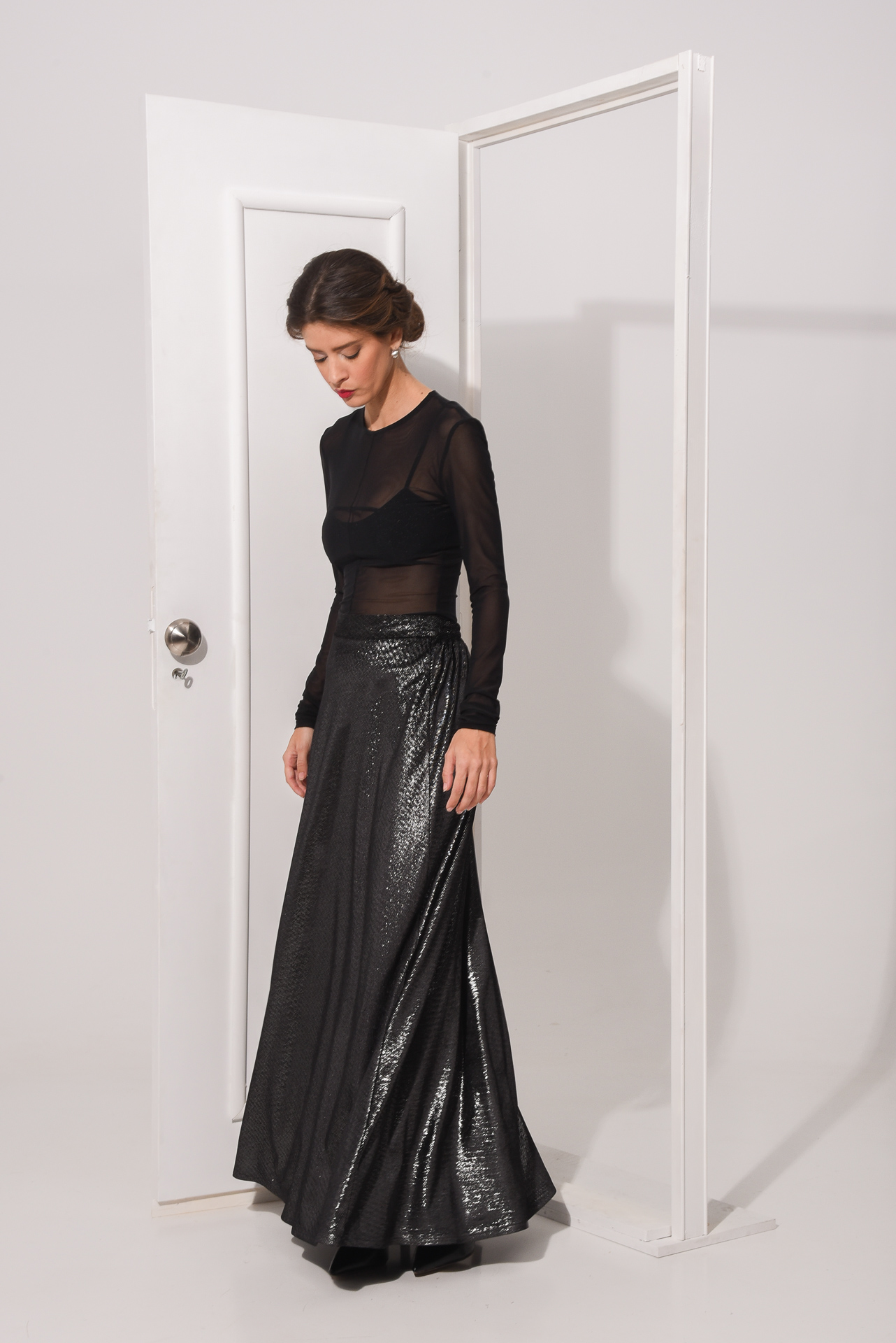 - The “Whisper” skirt exudes elegance with its fluid silhouette and glossy finish, creating a shimmering effect that catches the light. Designed with a flattering high waist and soft pleats, it offers a graceful flow with every step. Perfect for evening occasions, this maxi skirt is both bold and timeless.