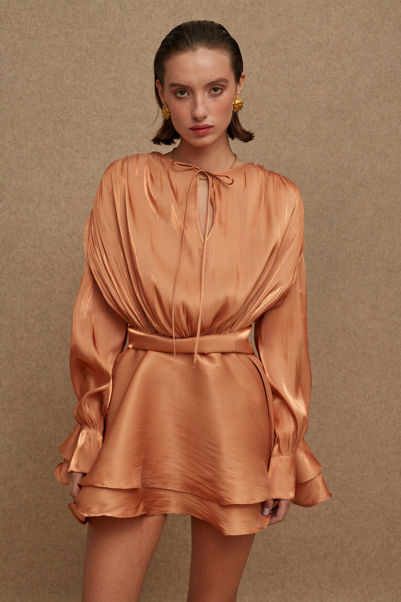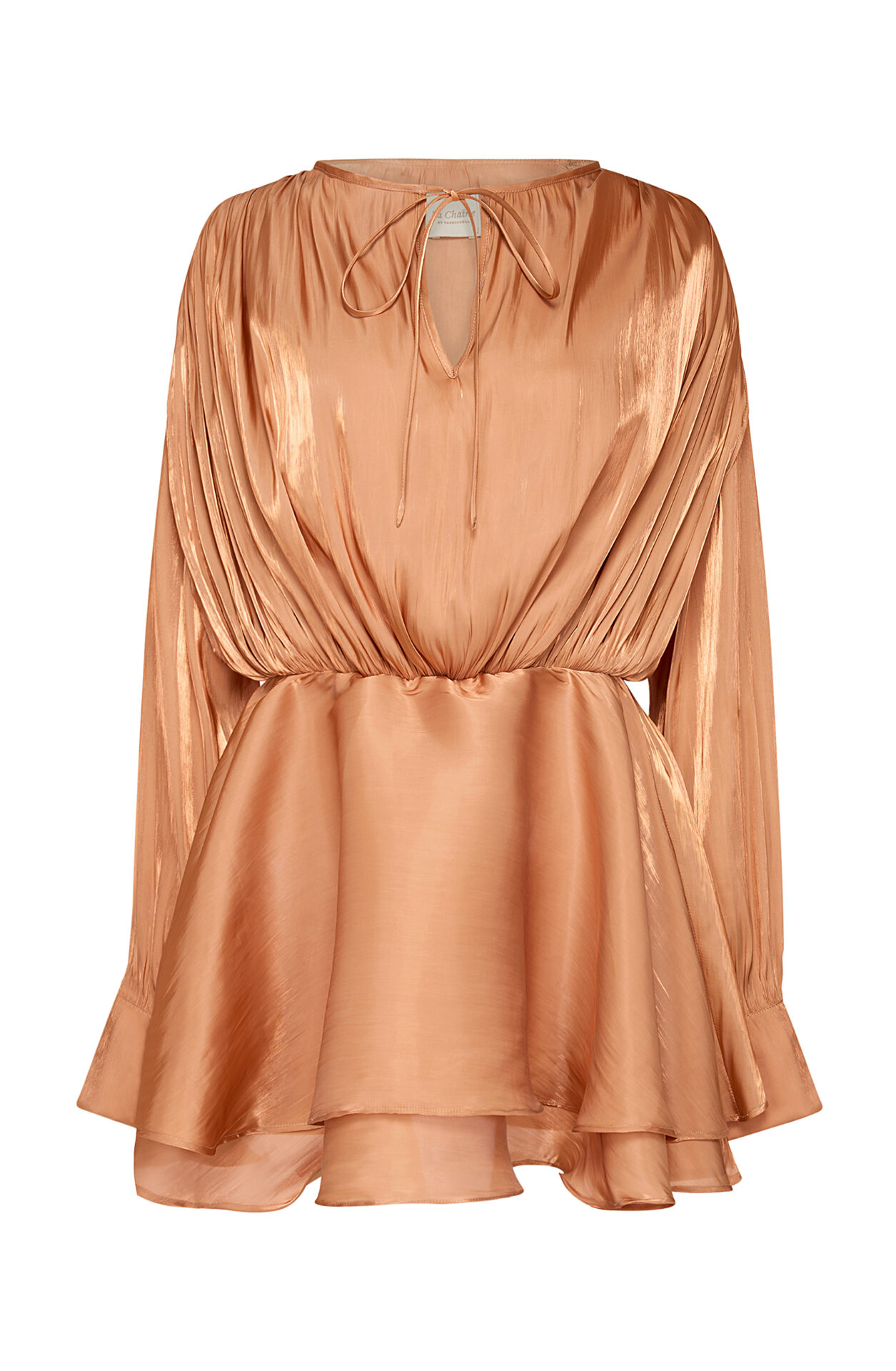 • A chiffon mini dress with flare design, fabric belt & a bow-tie on the front.